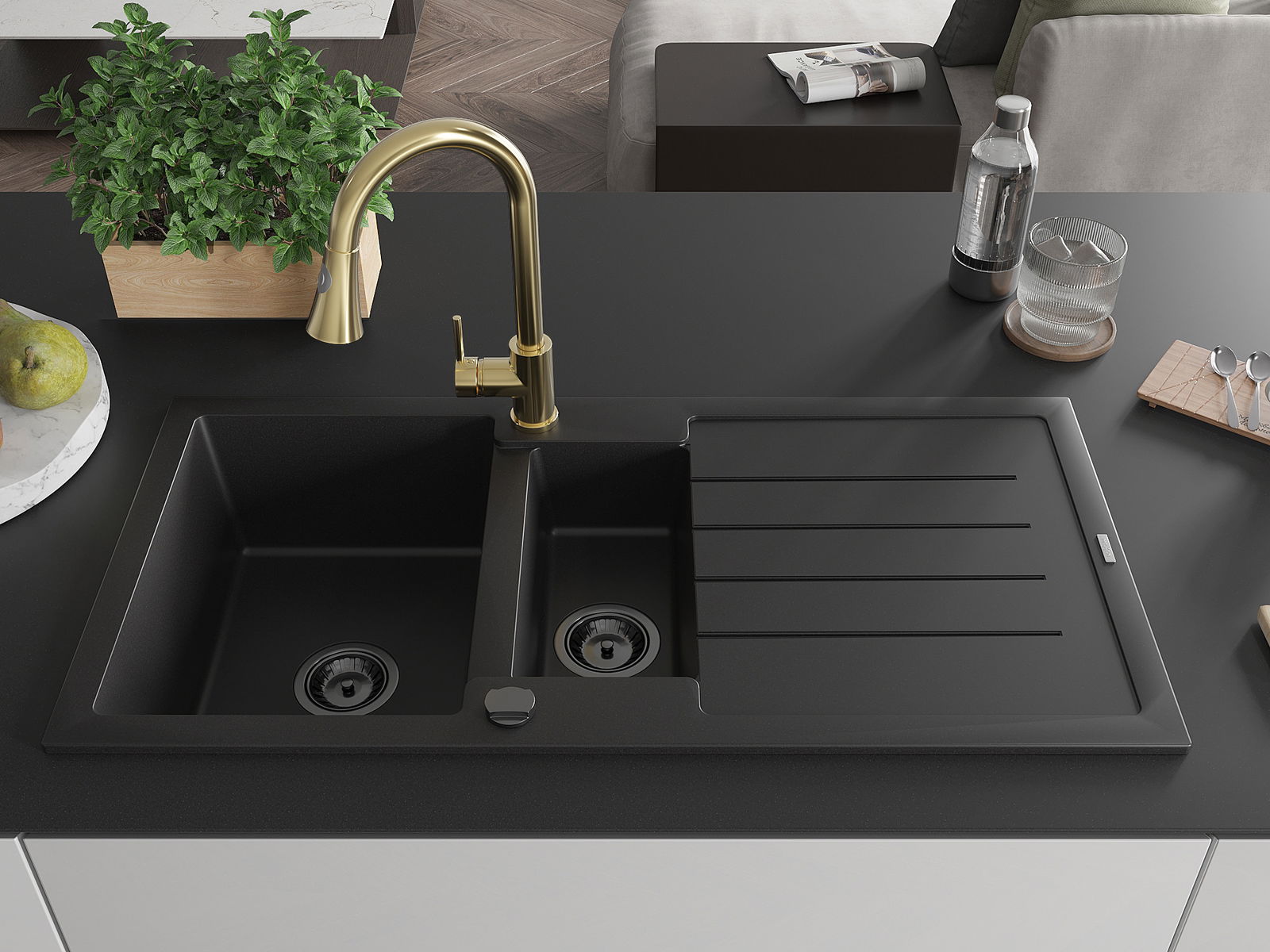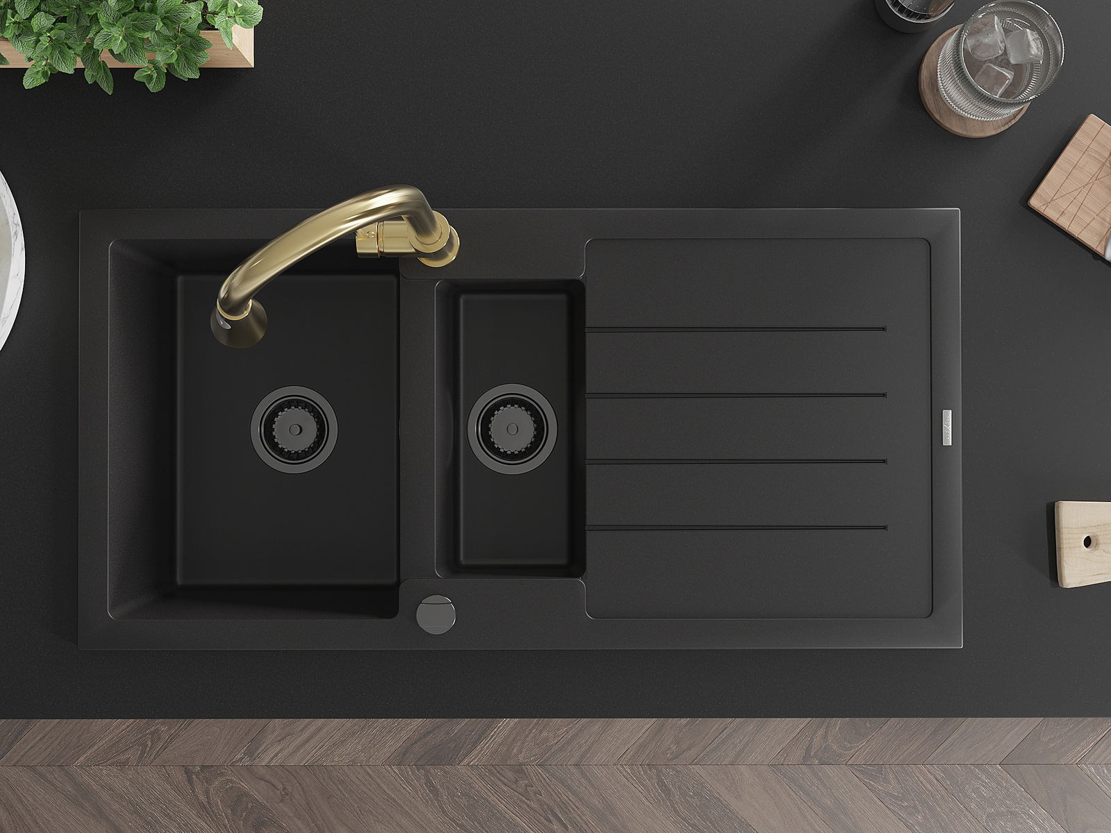 Mexen Andres évier en granit 1,5 bac avec égouttoir et robinet de cuisine Elia, noir - 6515-77-670101-50-B
