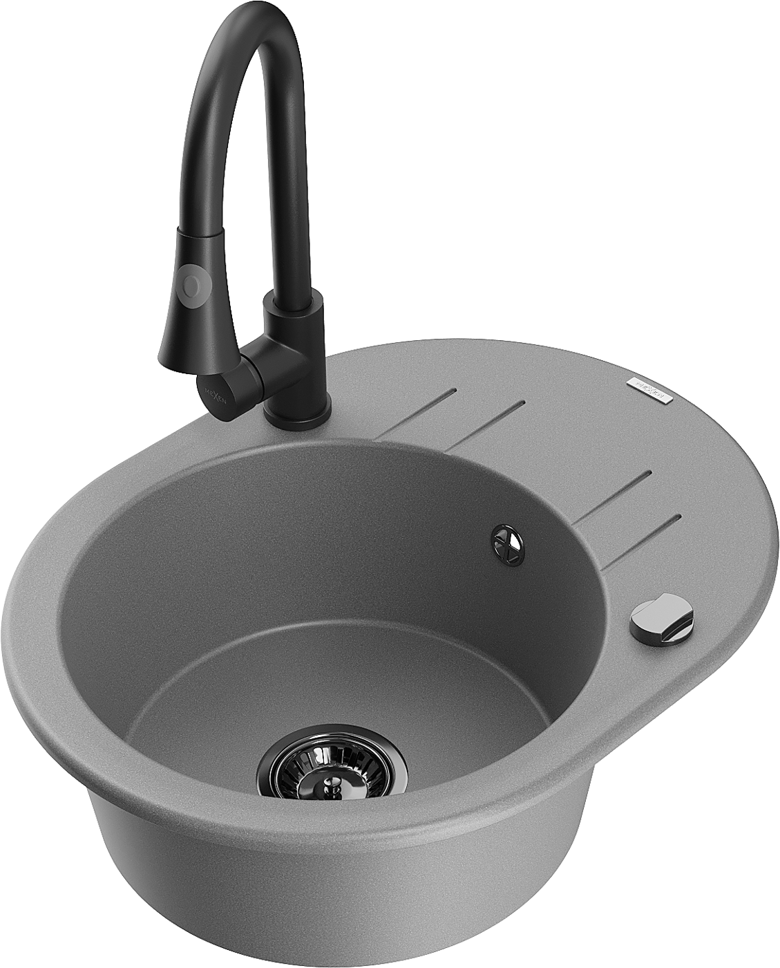 Mexen Kevin évier en granit 1 cuve avec égouttoir et robinet de cuisine Elia, gris - 6517-71-670101-70-B