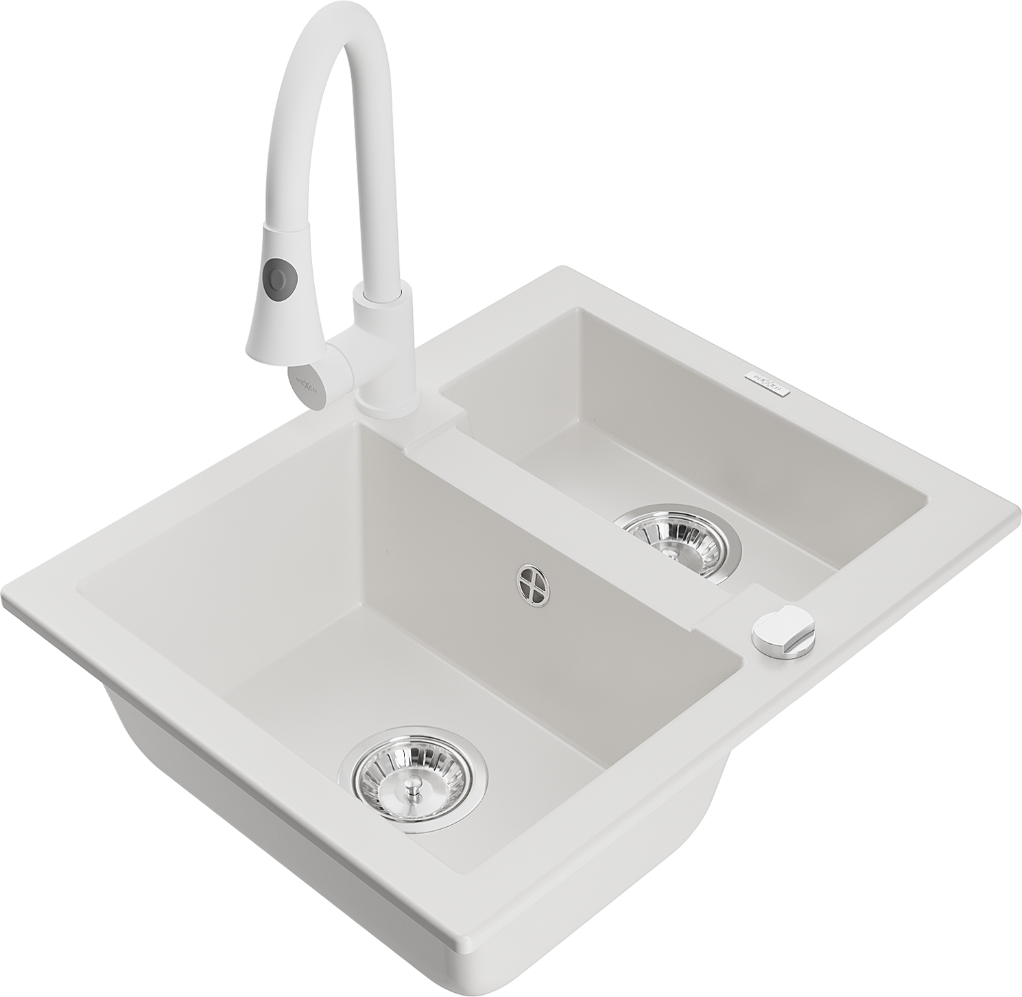 Mexen Carlos évier en granit 1,5 cuves avec robinet de cuisine Elia, blanc - 6518-20-670101-20