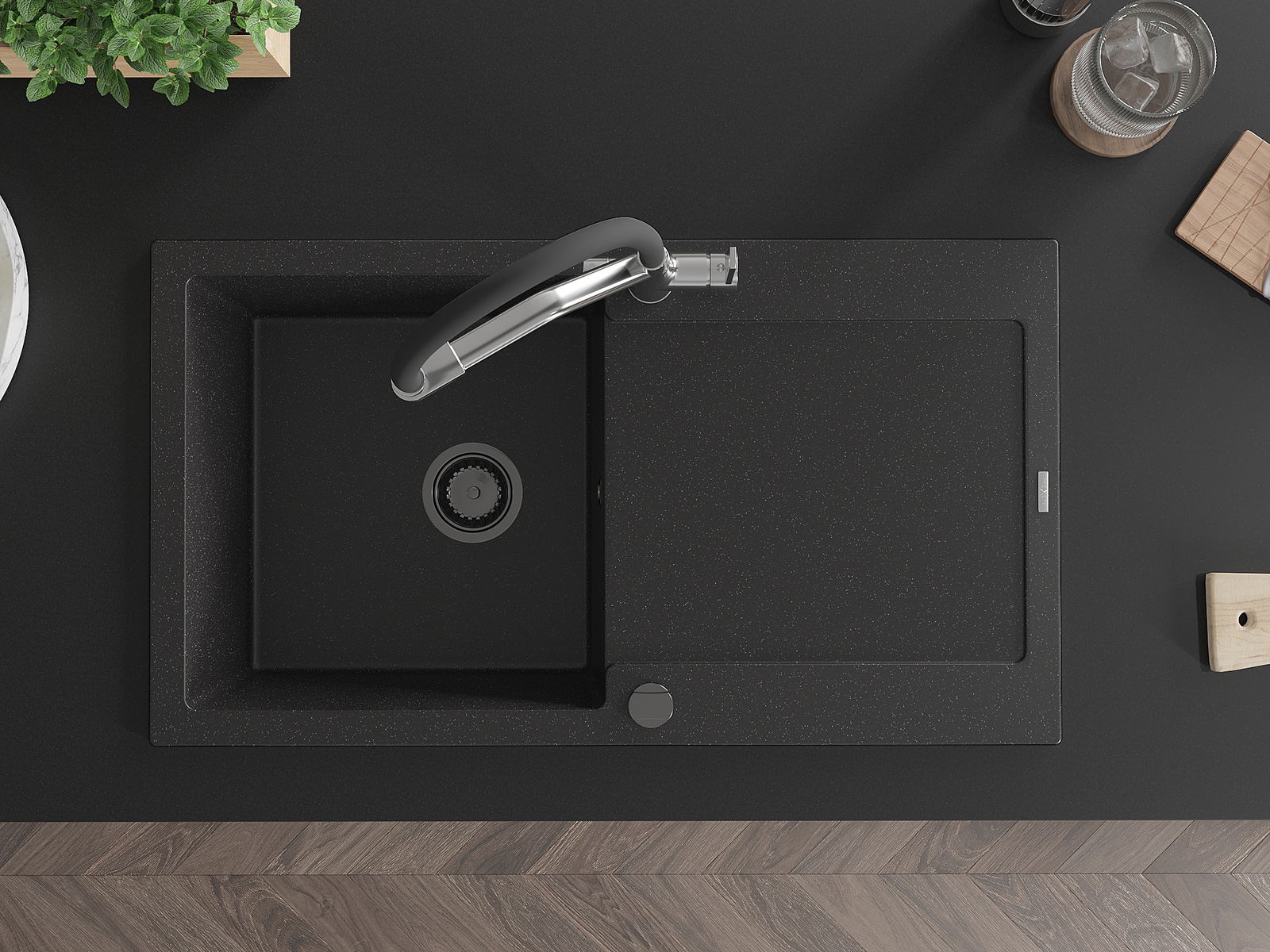 Mexen Leo évier en granit 1 bac avec égouttoir et mitigeur de cuisine Duo, noir/métallique argenté - 6501-73-671701-07-B