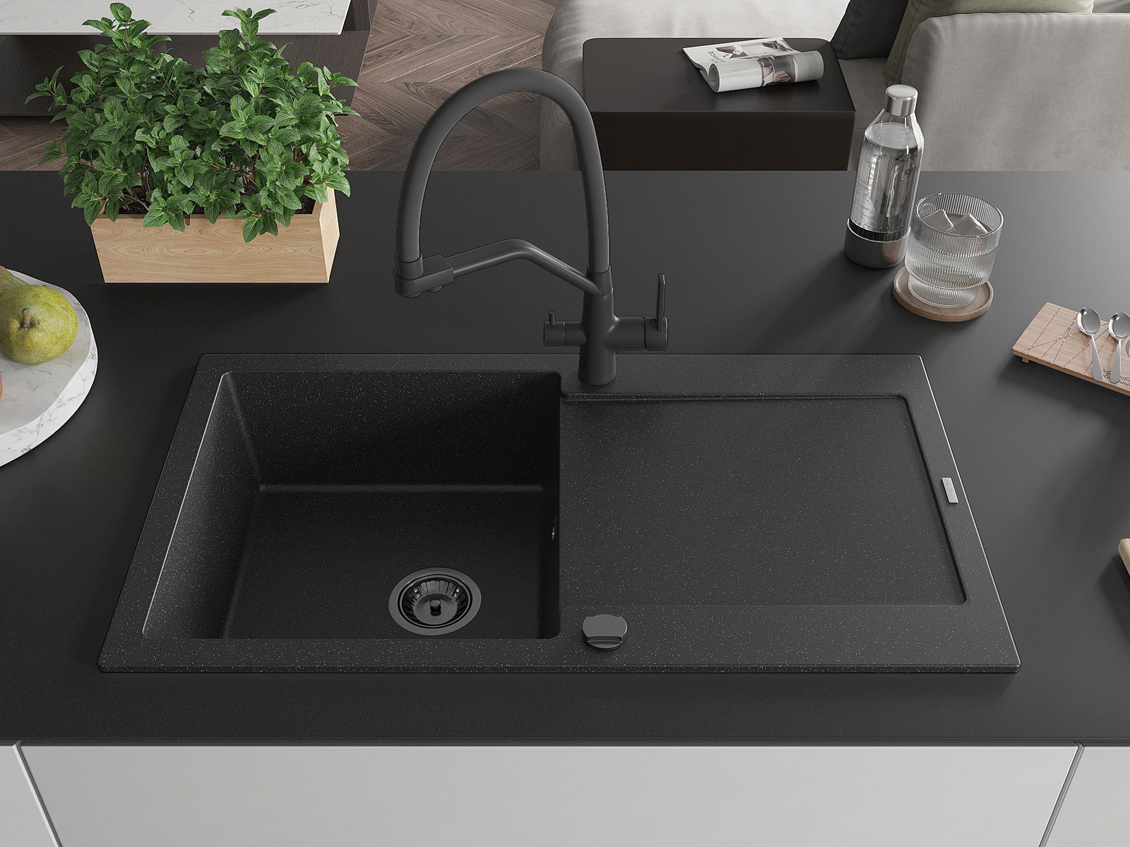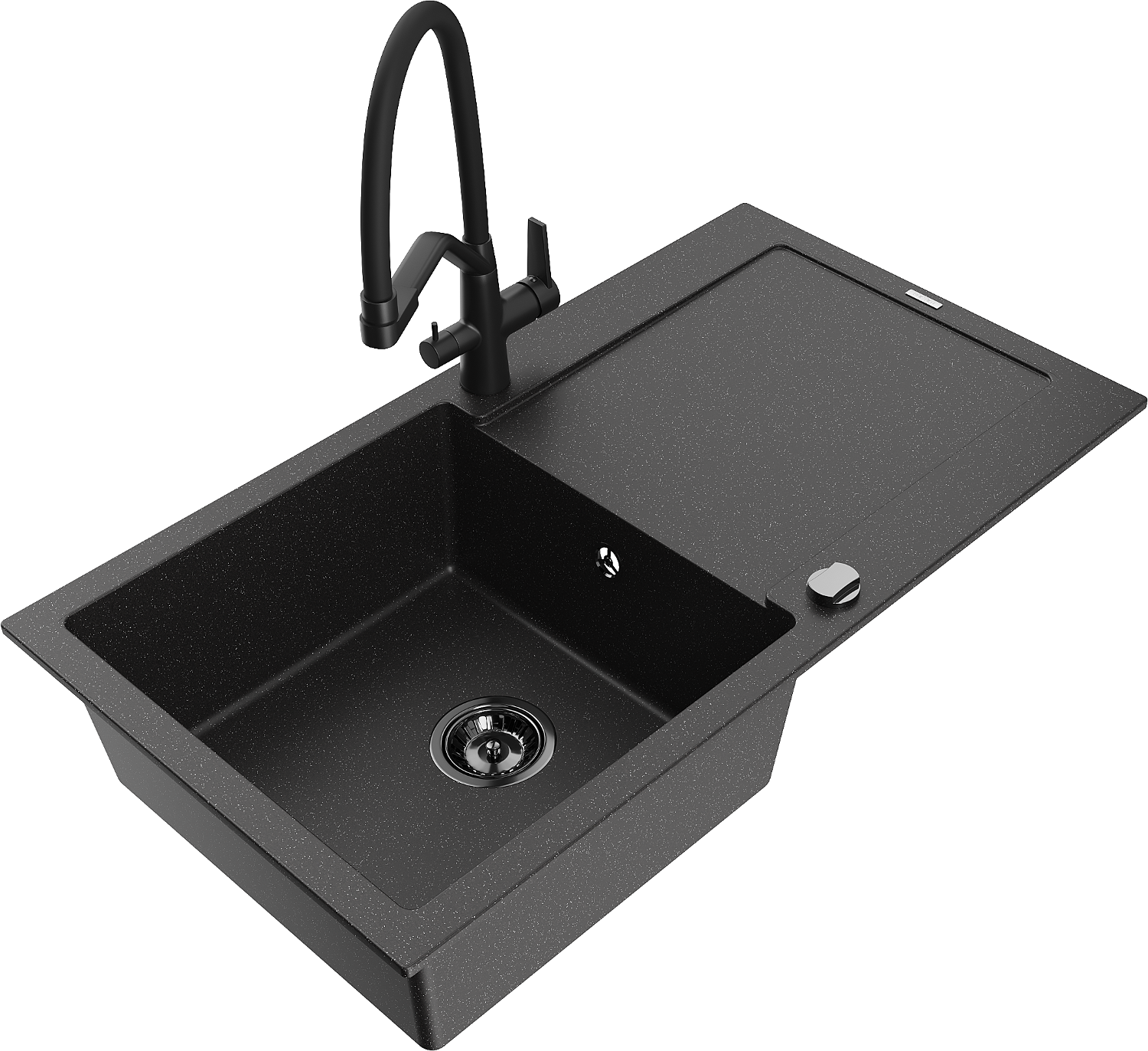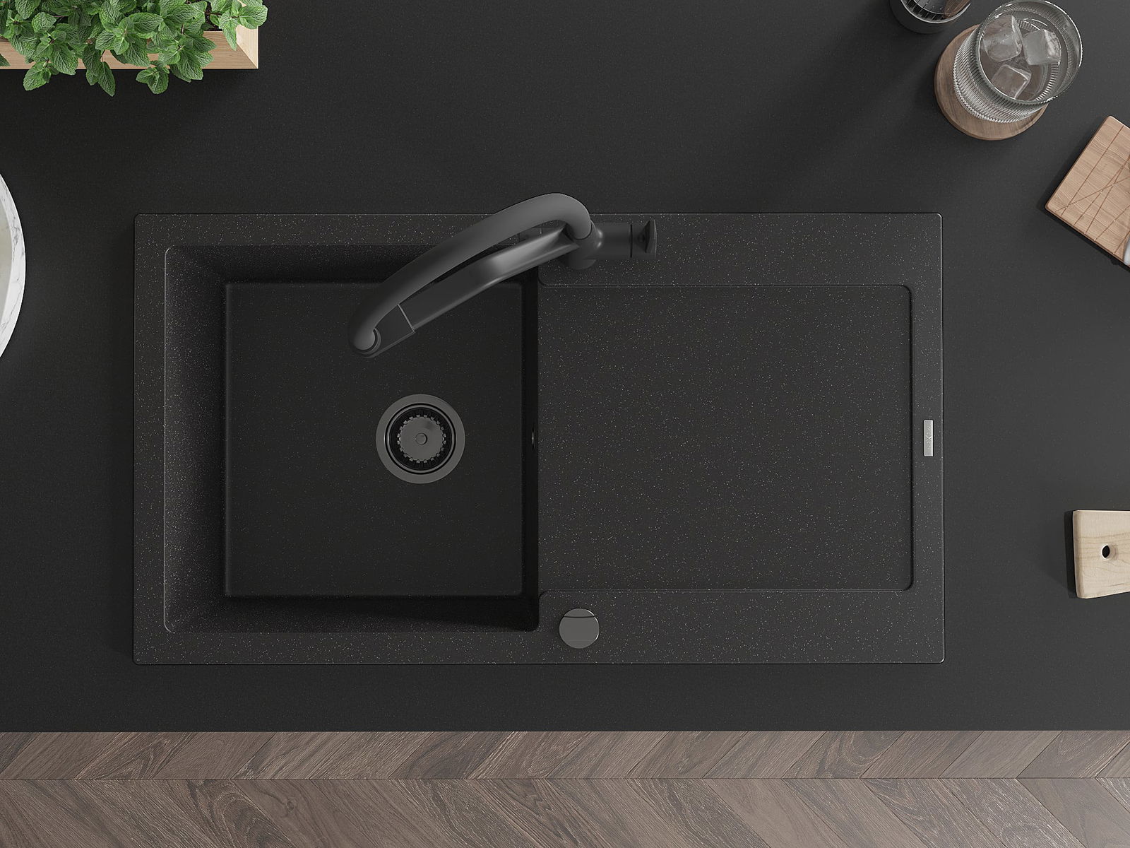 Mexen Leo évier de cuisine en granit 1 bac avec égouttoir et robinet Duo, noir/métallique argenté - 6501-73-671701-70-B