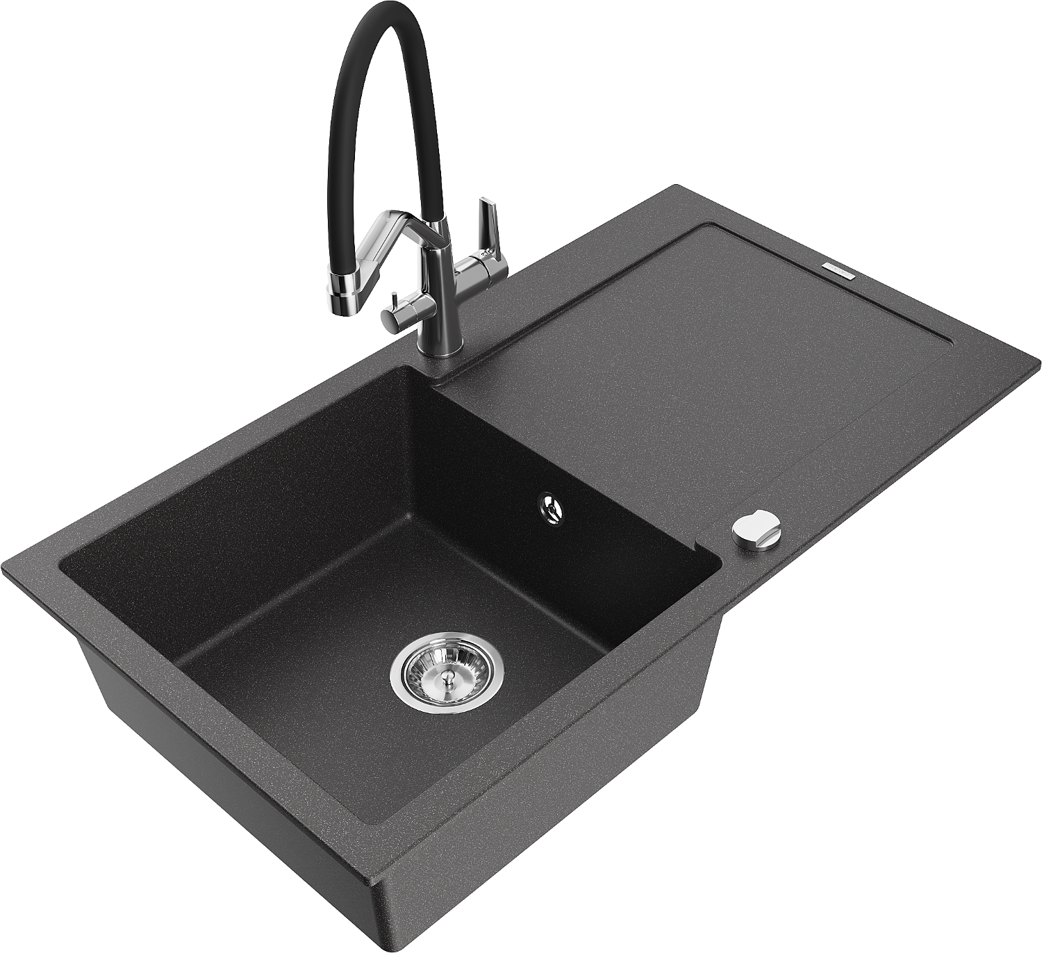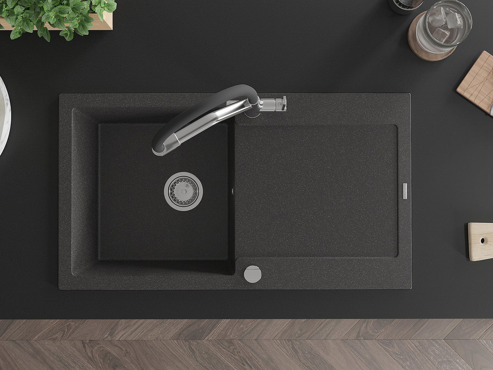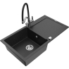 Mexen Leo évier en granit 1 bac avec égouttoir et robinet de cuisine Duo, noir moucheté - 6501-76-671701-07