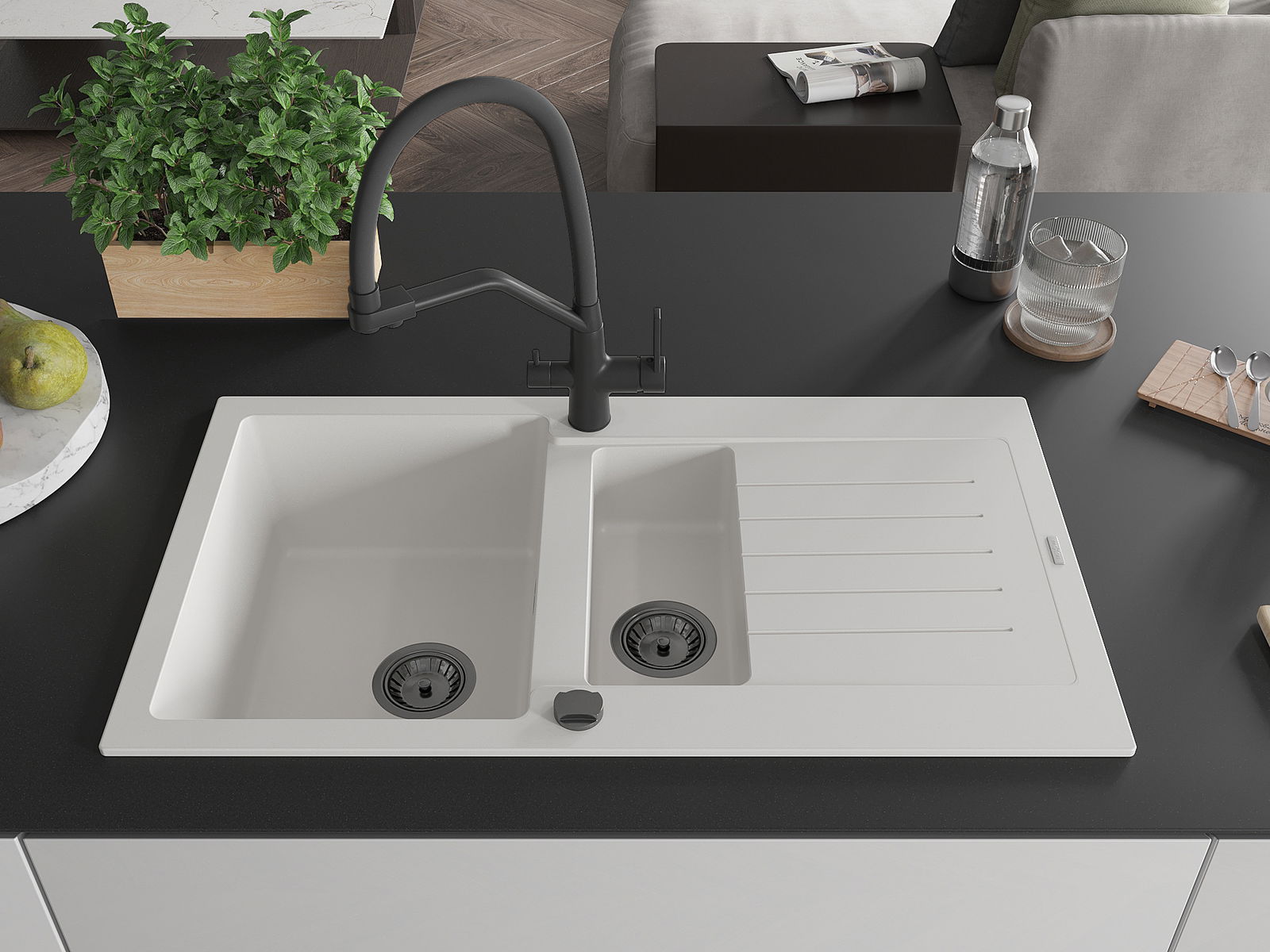 Mexen Matias évier en granit 1,5 bac avec égouttoir et robinet de cuisine Duo, blanc - 6502-20-671701-70-B