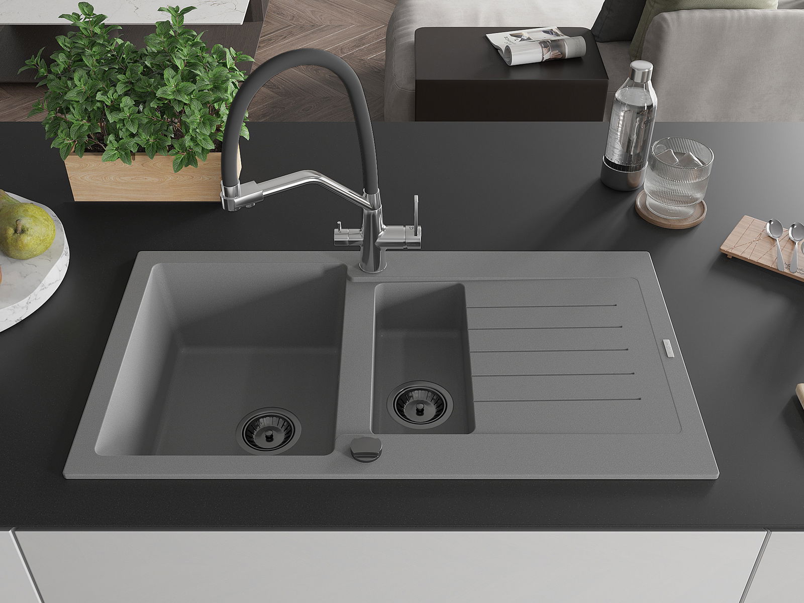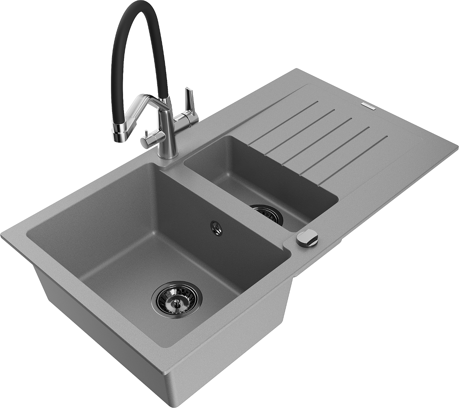 Mexen Matias évier en granit 1,5 bac avec égouttoir et robinet de cuisine Duo, gris - 6502-71-671701-07-B