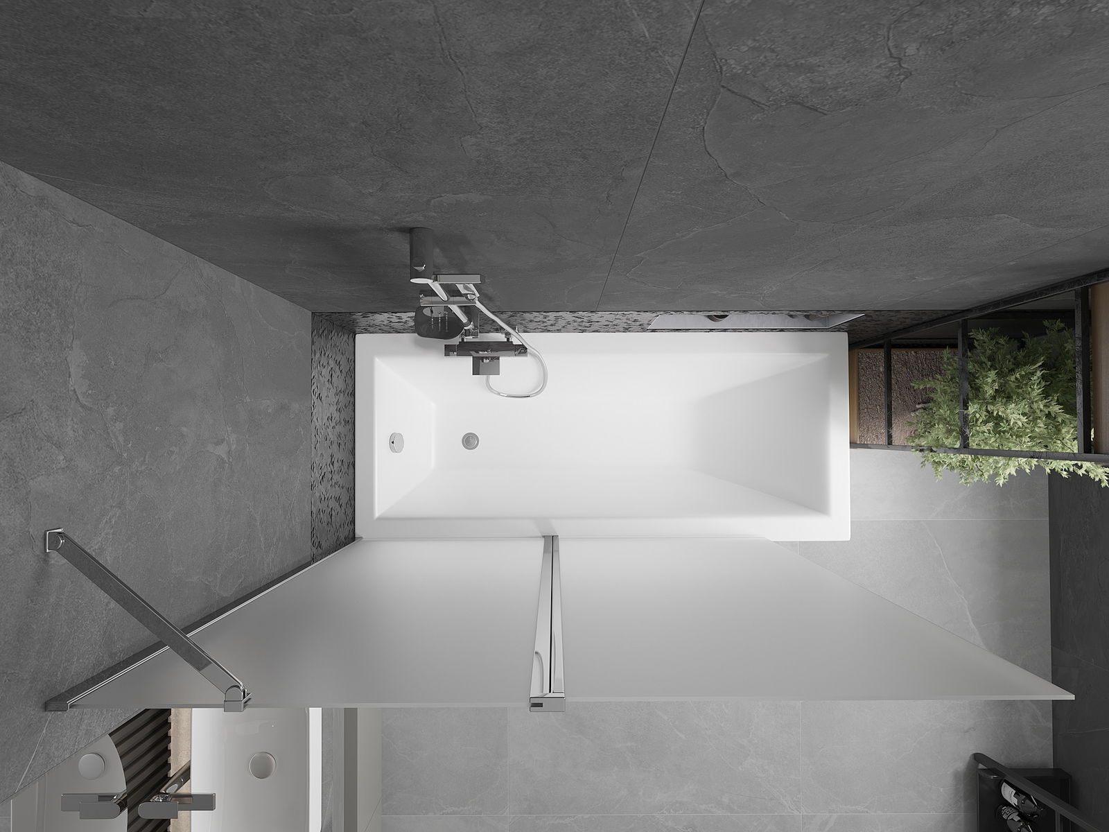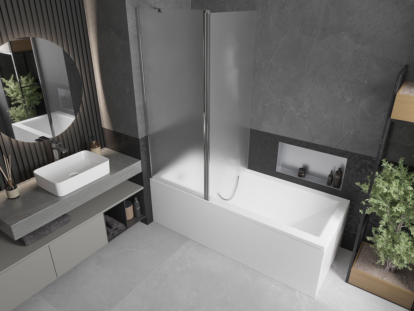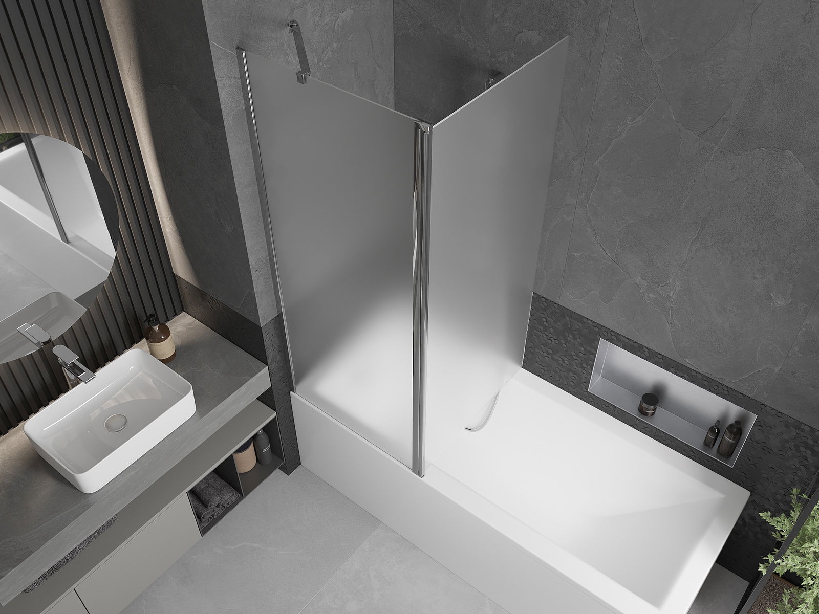 Le paravent est doté d'une aile mobile et pliable. Cette solution permet de gagner de la place dans la salle de bains et d'utiliser l'espace restant lorsque l'on ne se baigne pas.