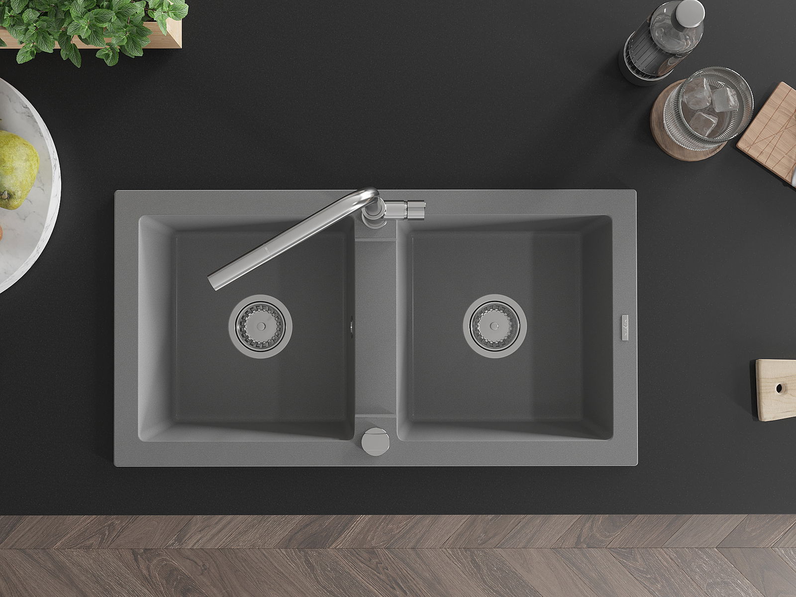 Mexen Mario évier en granit à 2 bacs avec robinet de cuisine Flora, gris - 6504-71-670401-00