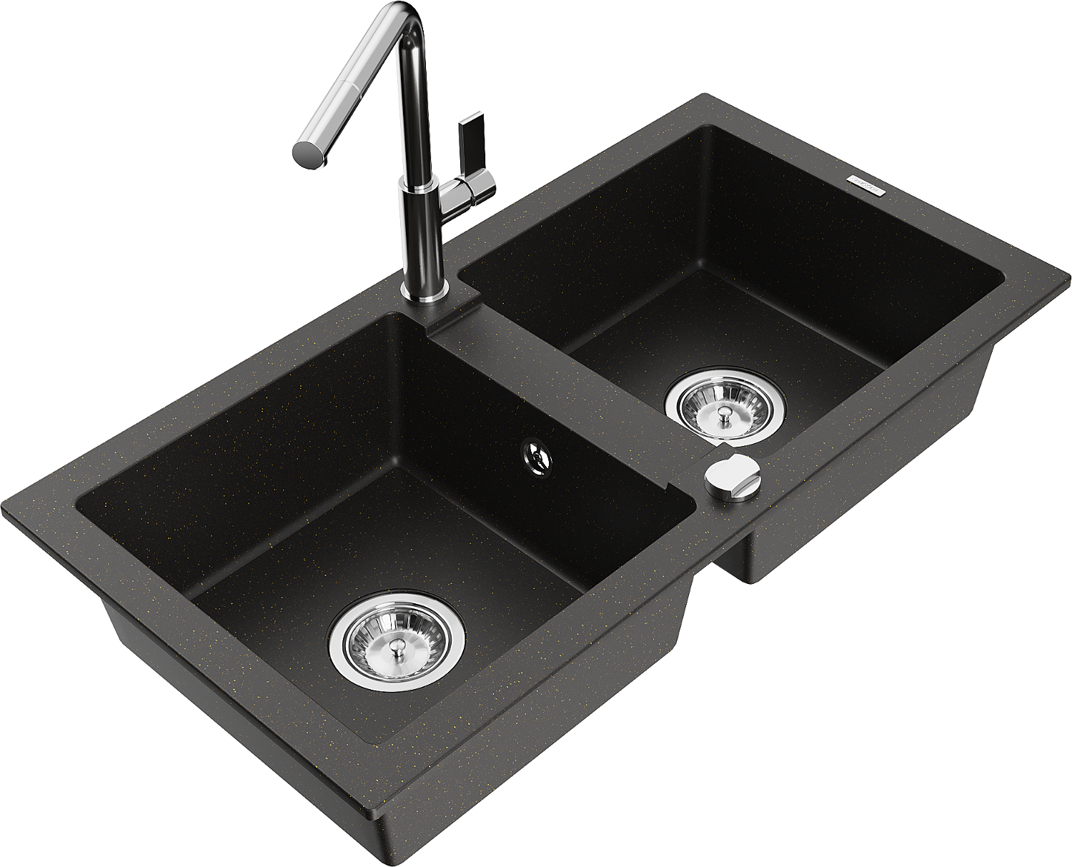 Mexen Mario évier en granit 2 bacs avec robinet de cuisine Flora, noir/or métallique - 6504-75-670401-00