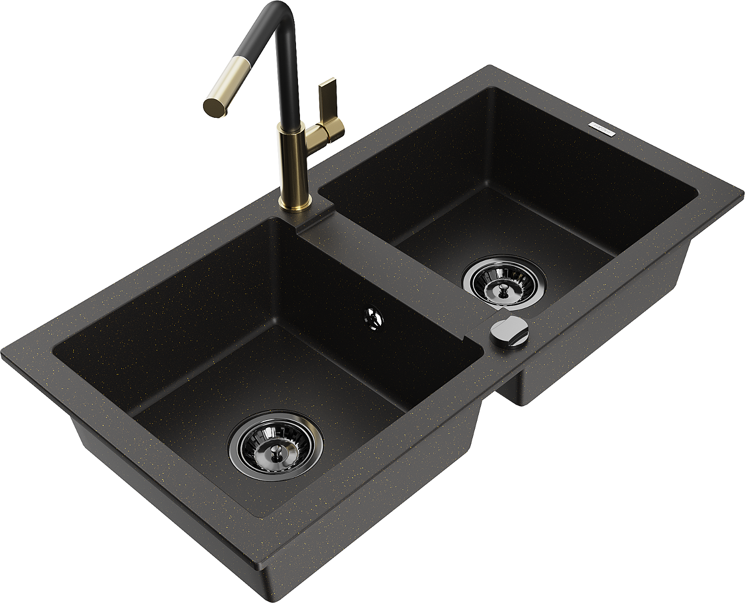Mexen Mario évier en granit à 2 bacs avec robinet de cuisine Flora, noir/or métallisé - 6504-75-670401-57-B