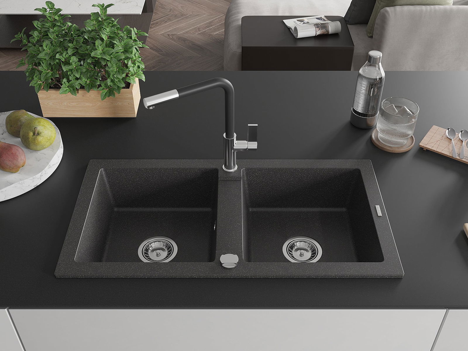 Mexen Mario évier en granit à 2 bacs avec robinet de cuisine Flora, noir moucheté - 6504-76-670401-07