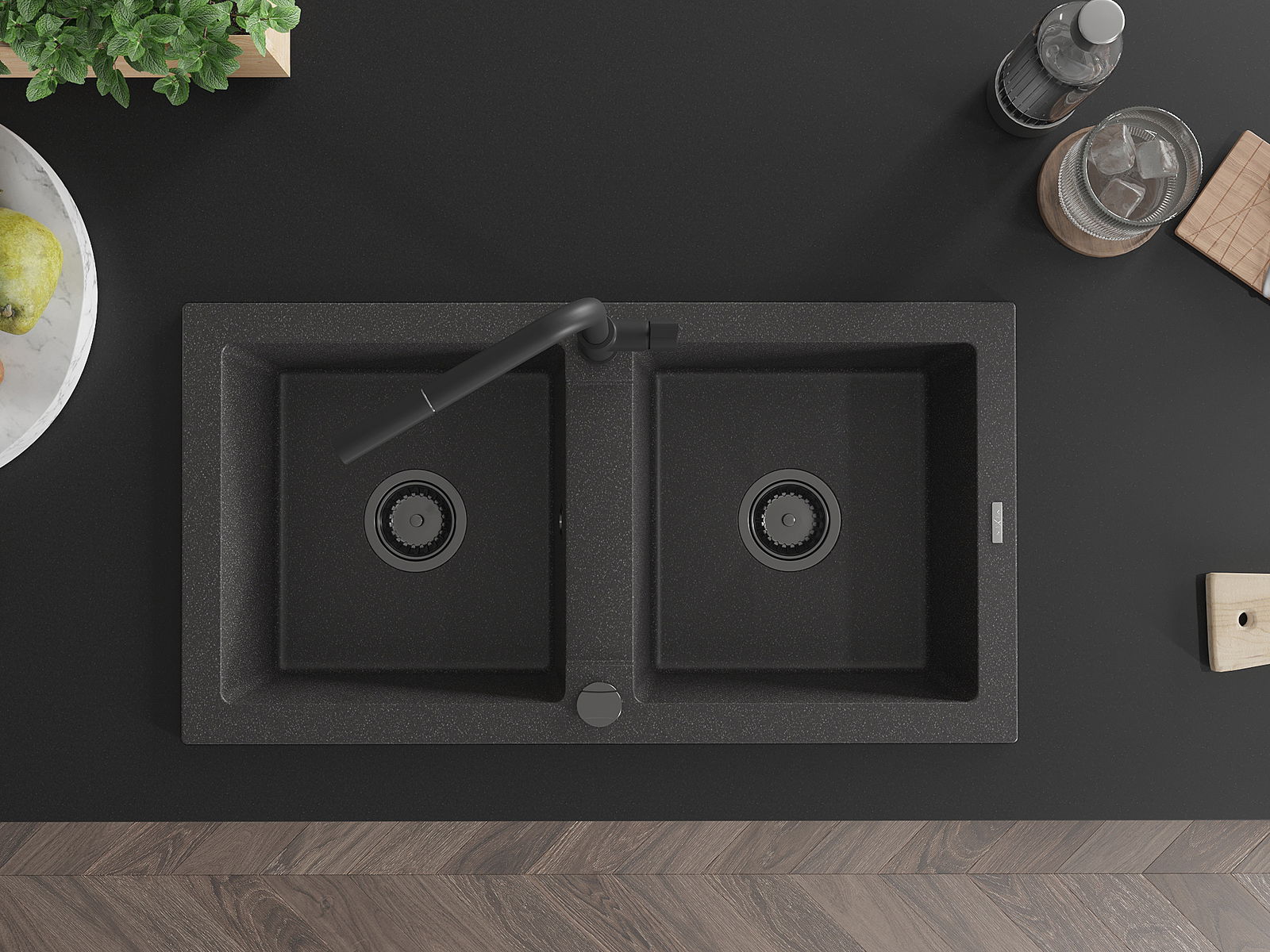 Mexen Mario évier en granit à 2 bacs avec robinet de cuisine Flora, noir moucheté - 6504-76-670401-70-B