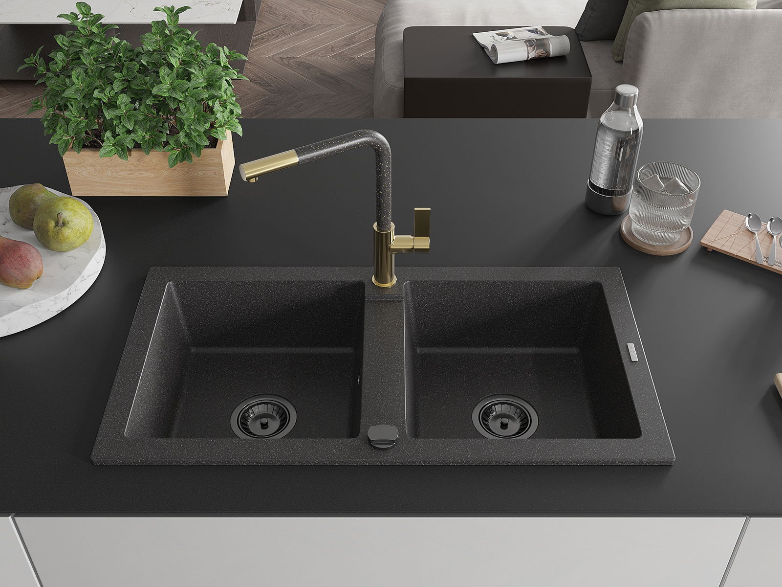 Mexen Mario évier en granit, 2 bacs avec robinet de cuisine Flora, noir moucheté - 6504-76-670401-75-B