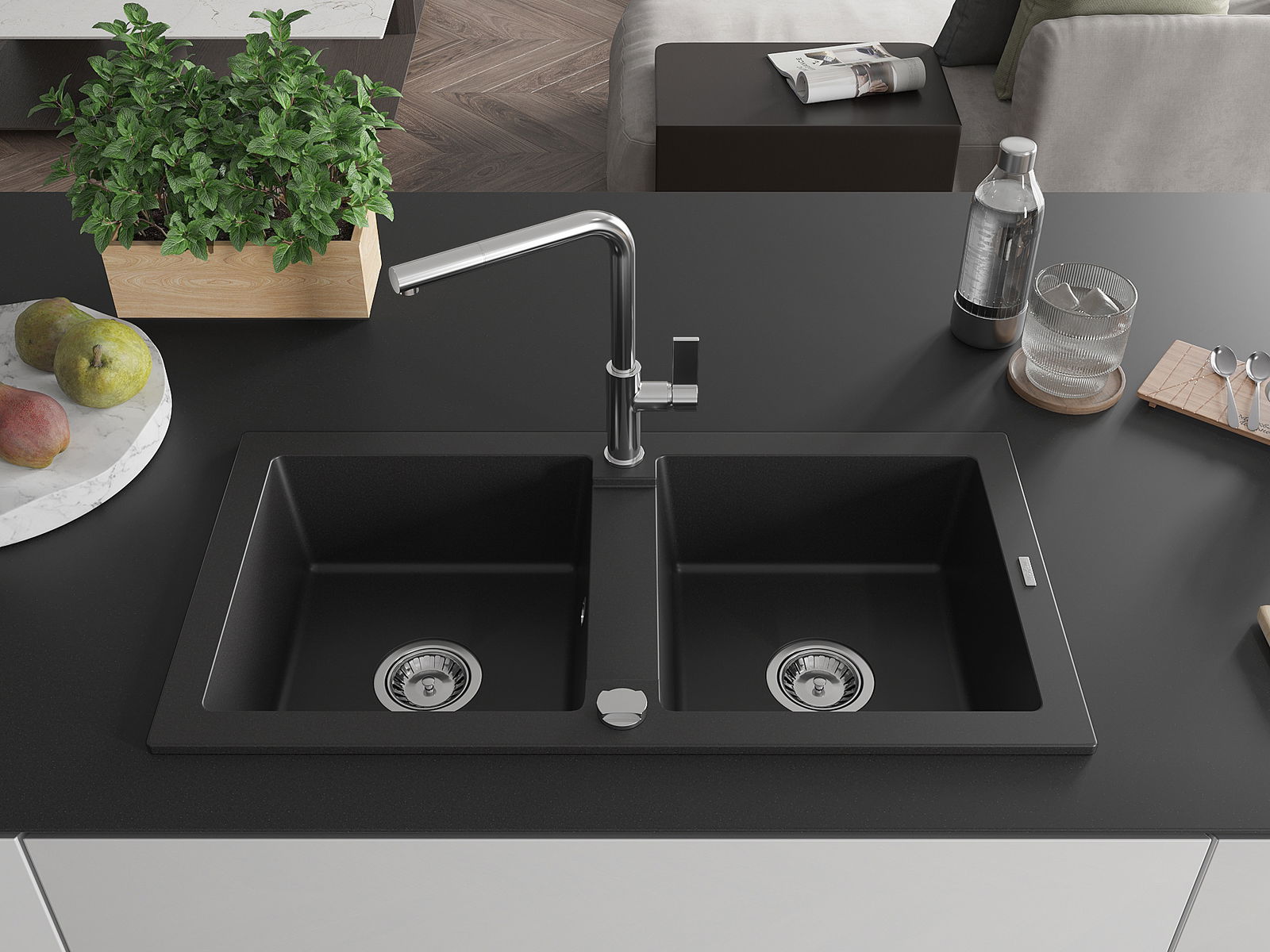 Mexen Mario évier de cuisine en granit à 2 bacs avec robinet Flora, noir - 6504-77-670401-00