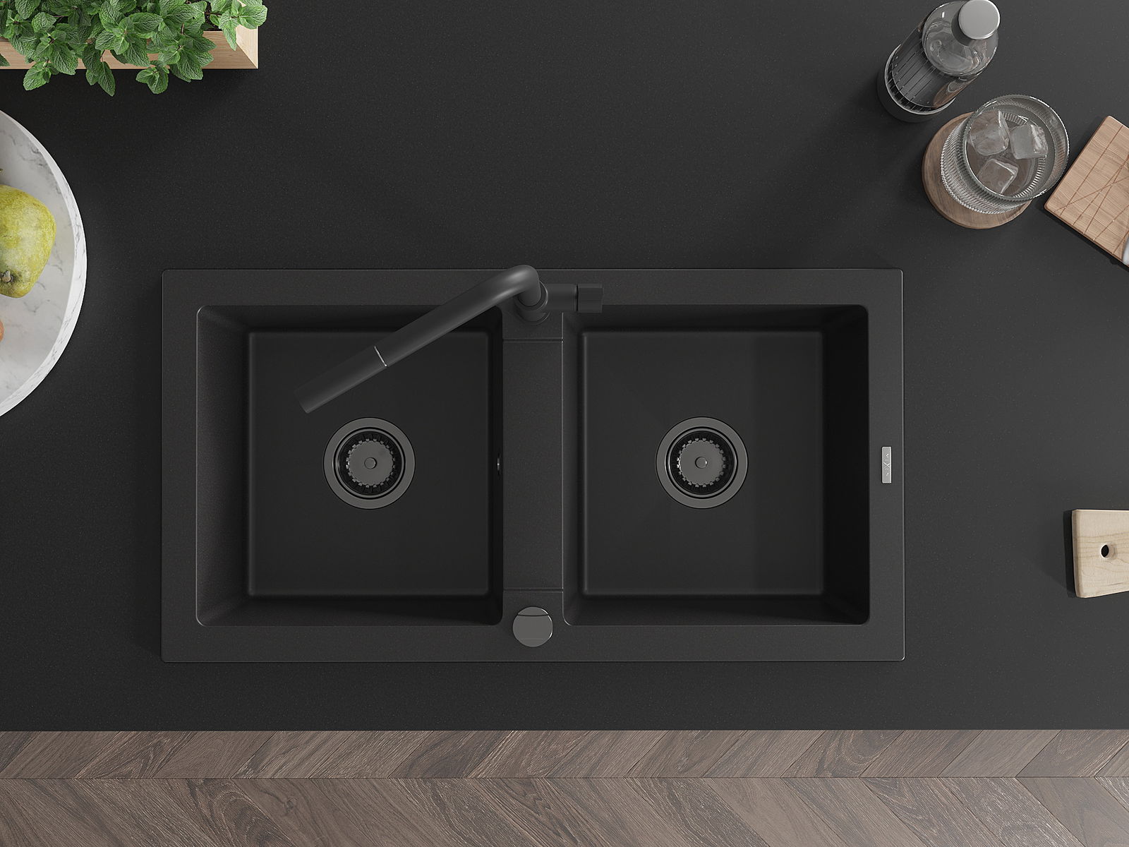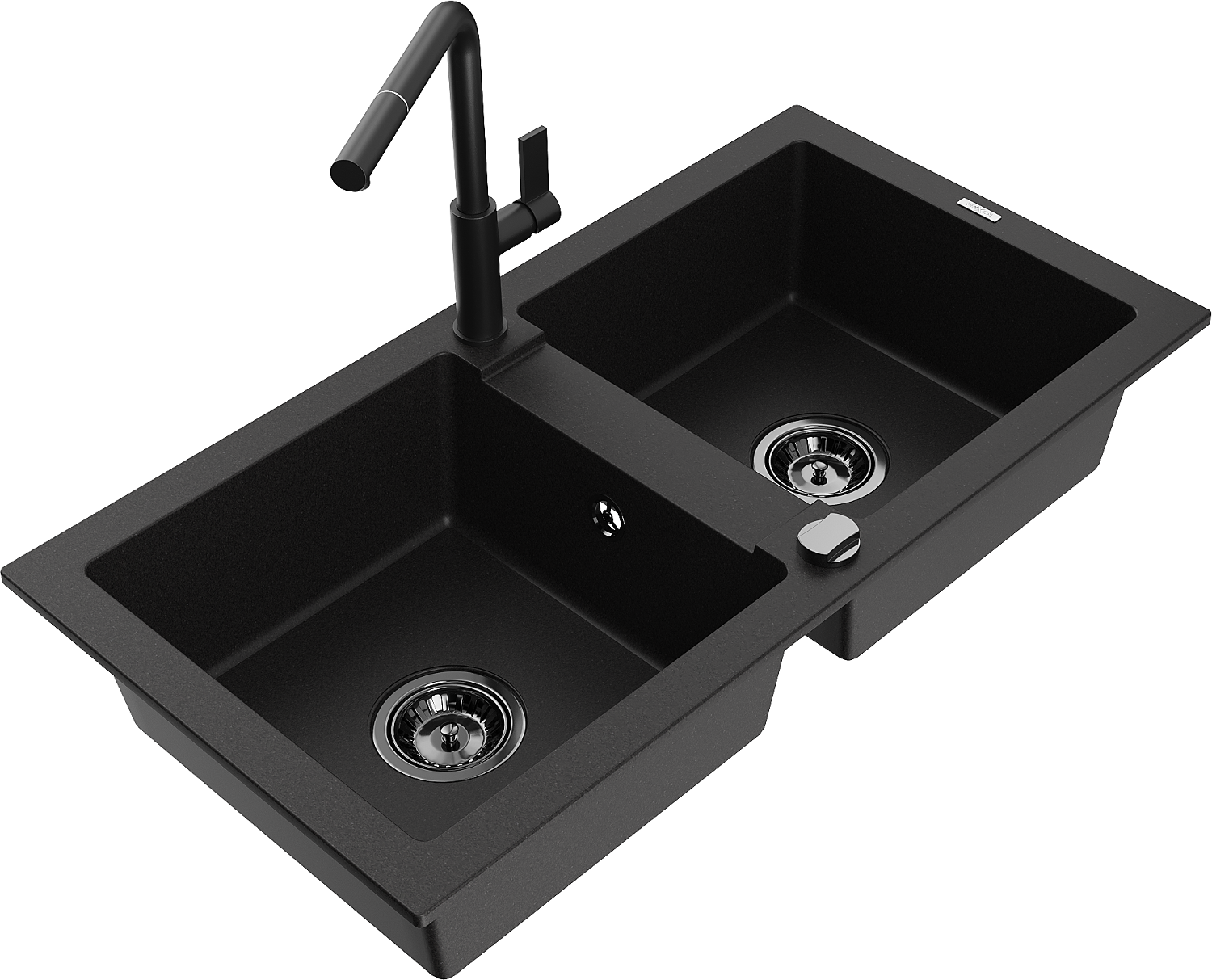Mexen Mario évier en granit à 2 bacs avec robinet de cuisine Flora, noir - 6504-77-670401-70-B