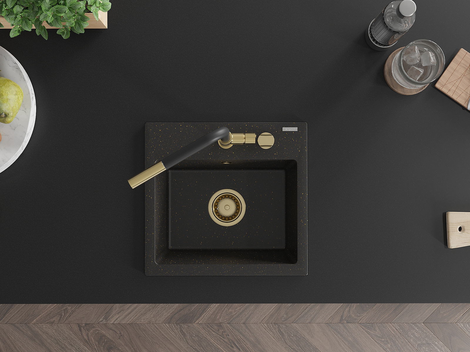 Mexen Milo évier de cuisine en granit à 1 bac avec robinet Flora, noir/doré métallique - 6505-75-670401-57-G