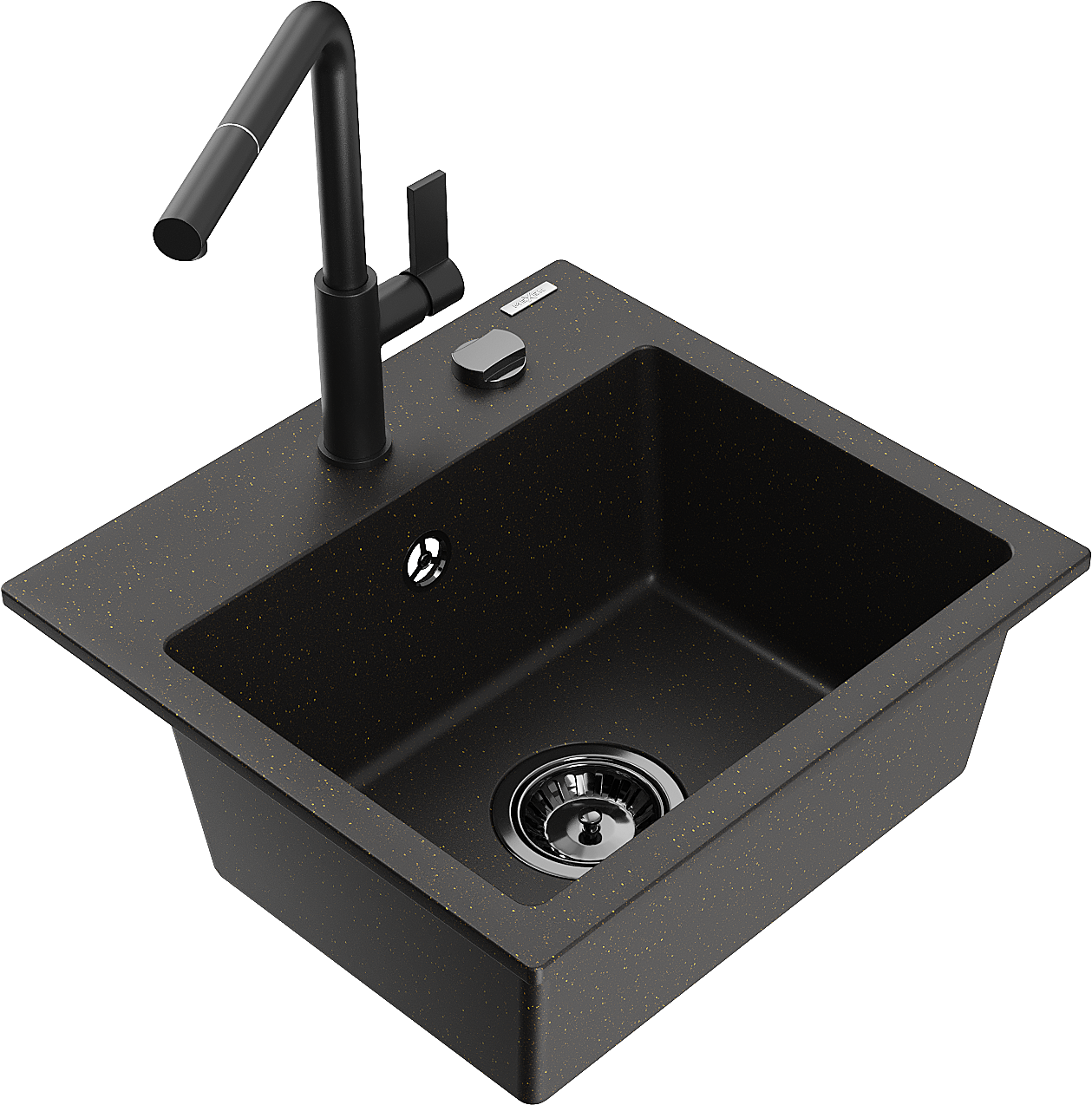 Mexen Milo évier en granit 1 bac avec mitigeur de cuisine Flora, noir/doré métallisé - 6505-75-670401-70-B