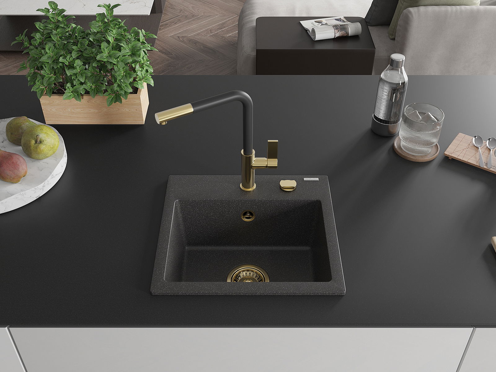 L'évier a un trou sous-meulé de 35 mm de diamètre à percer soi-même. Il peut être utilisé, entre autres, pour installer un distributeur de liquide, ce qui éliminera la présence de bouteilles en plastique dans la cuisine et lui donnera une finition élégante.