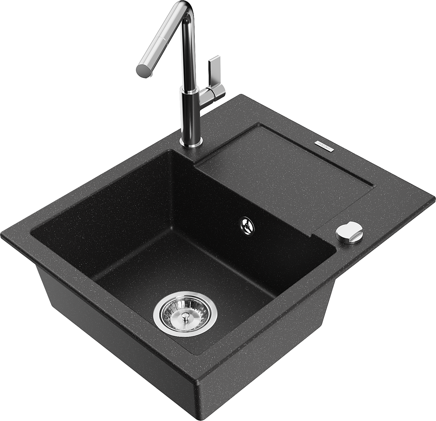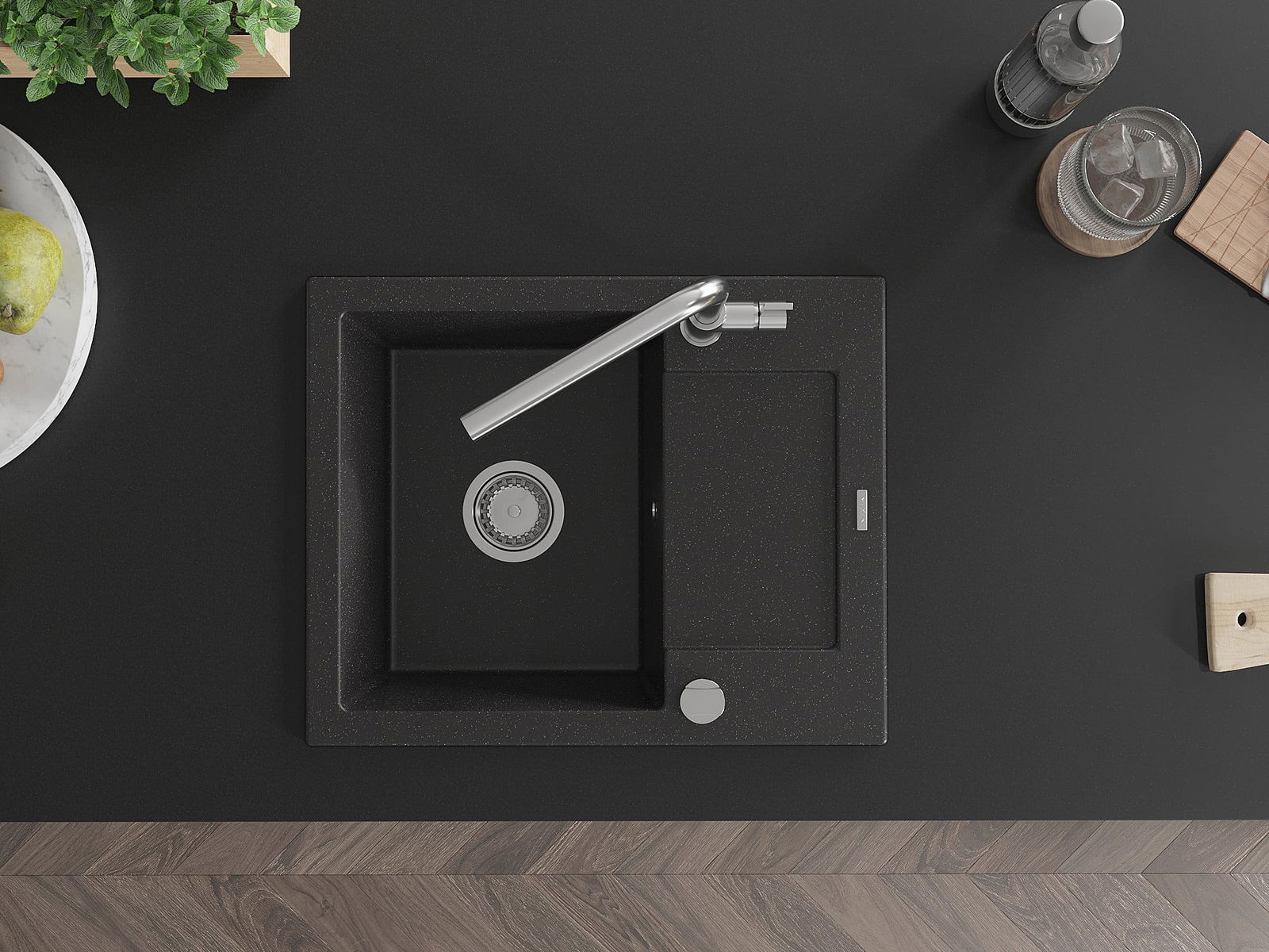 Mexen Enzo évier granitique 1 bac avec égouttoir et robinet de cuisine Flora, noir/métal argenté - 6506-73-670401-00