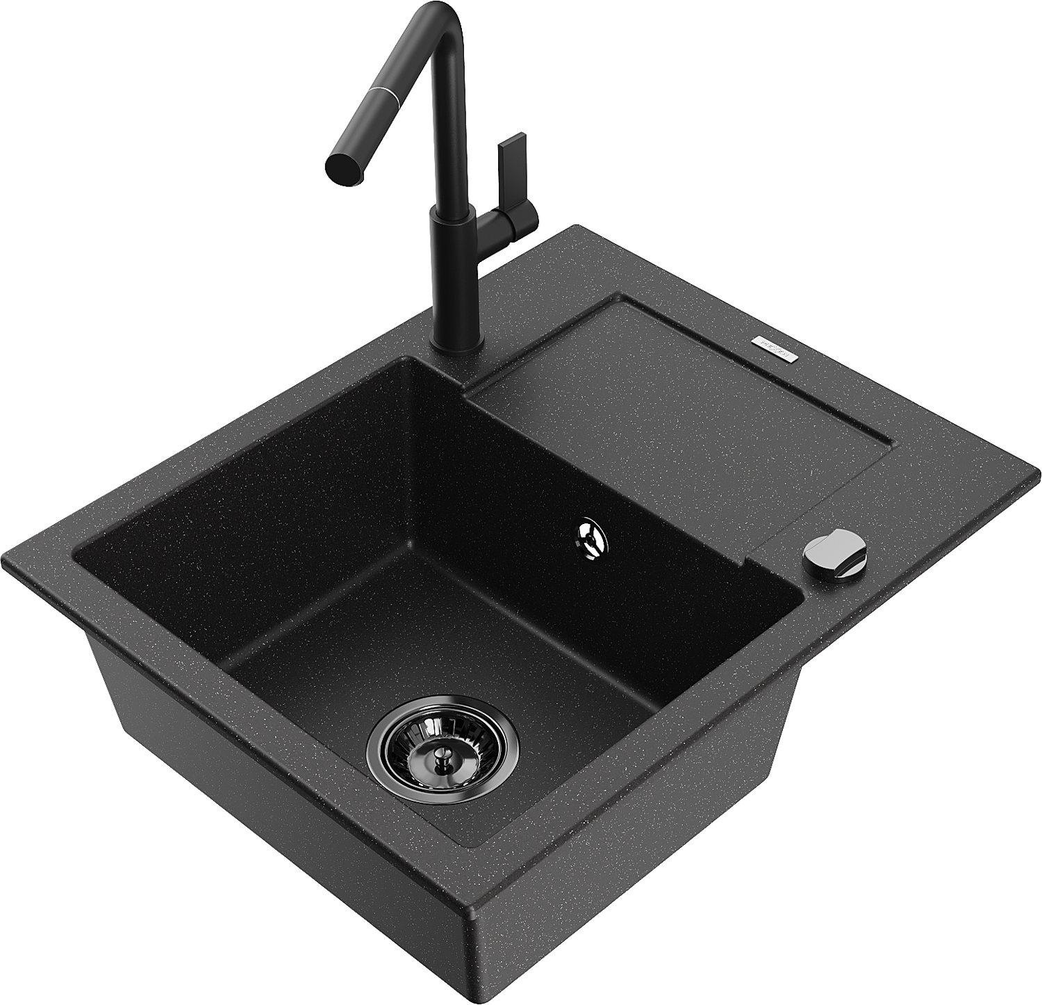 Mexen Enzo évier en granit 1 bac avec égouttoir et robinet de cuisine Flora, noir/argent métallisé - 6506-73-670401-70-B