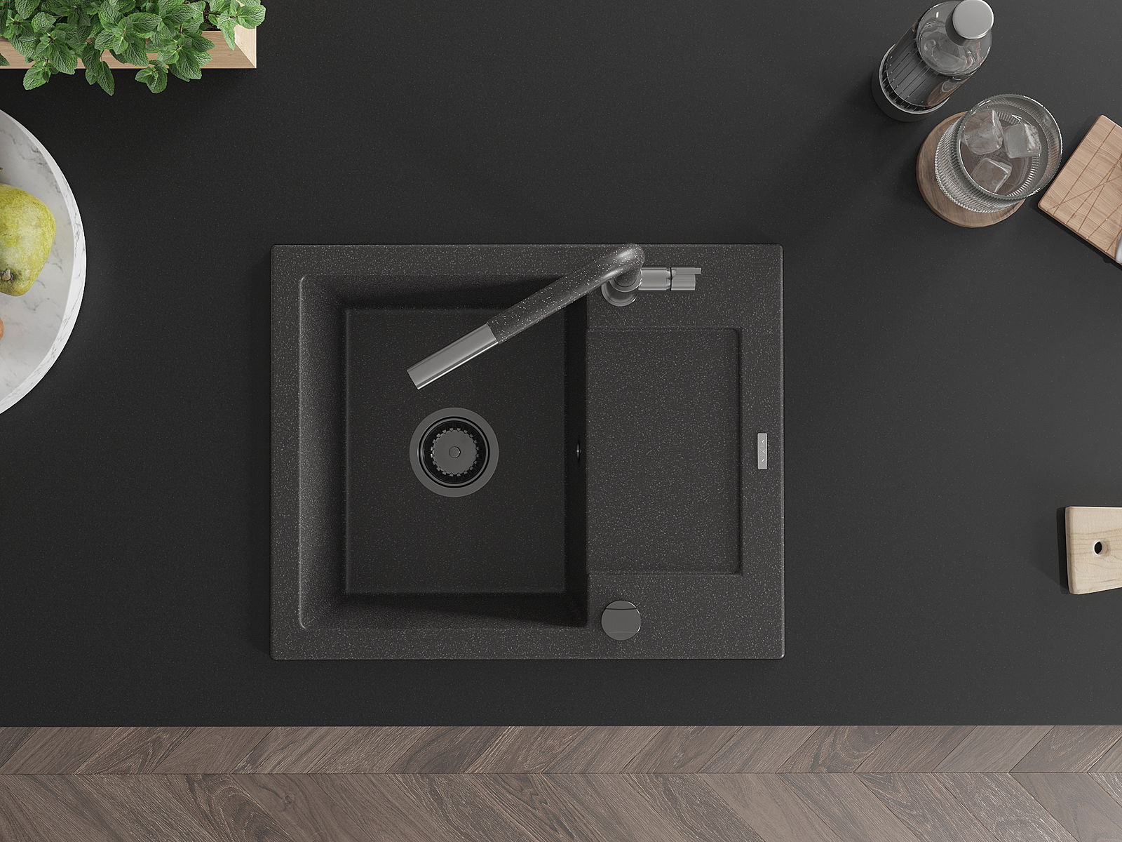 Mexen Enzo évier en granit à 1 cuve avec égouttoir et robinet de cuisine Flora, noir moucheté - 6506-76-670401-08-B