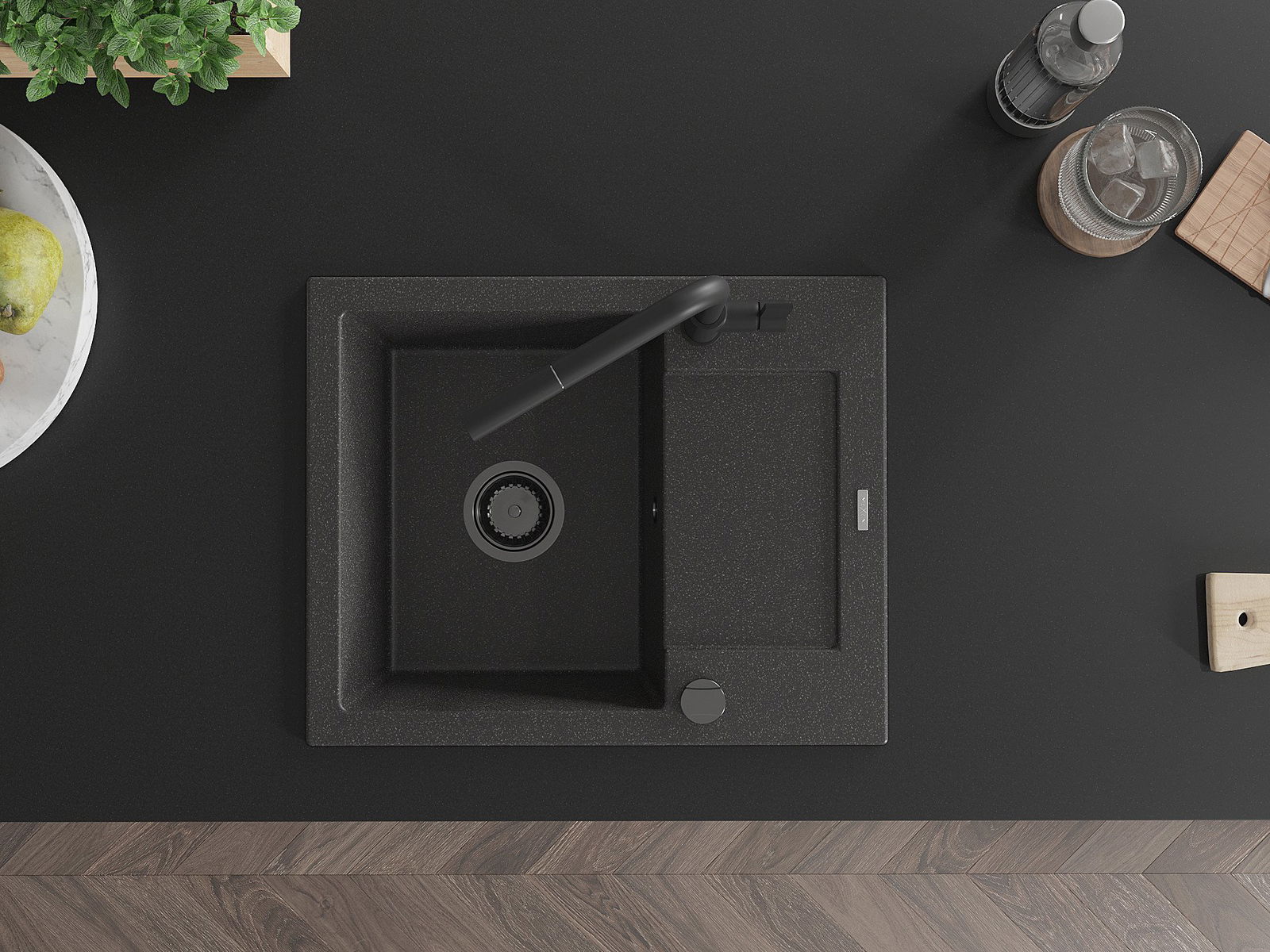 Mexen Enzo évier en granit 1 bac avec égouttoir et robinet de cuisine Flora, noir moucheté - 6506-76-670401-70-B