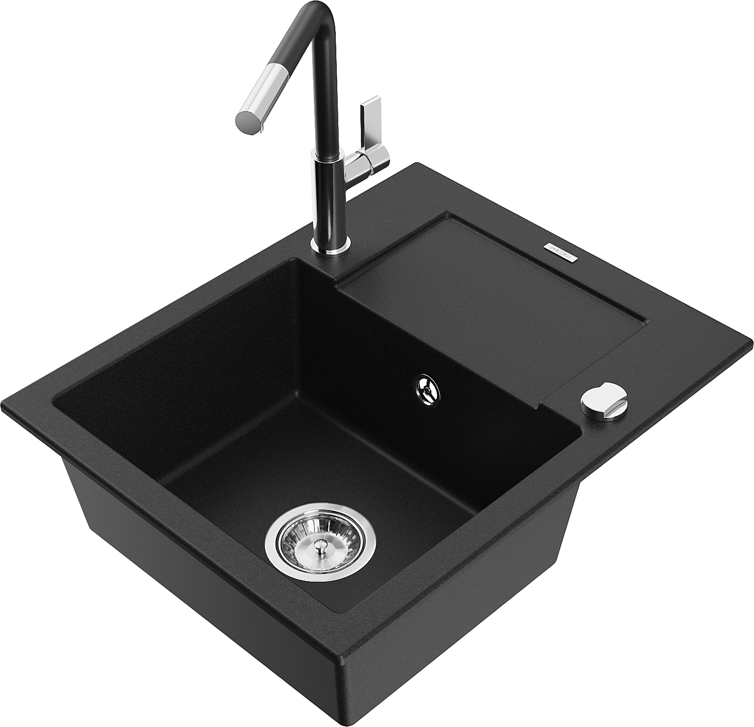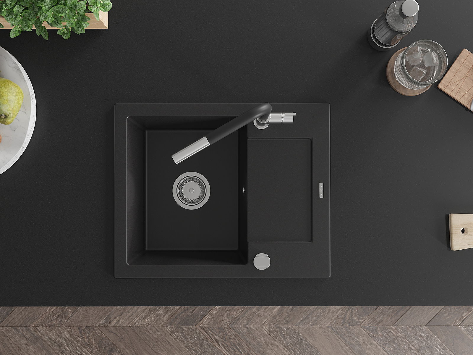 Mexen Enzo évier en granit 1 bac avec égouttoir et robinet de cuisine Flora, noir - 6506-77-670401-07