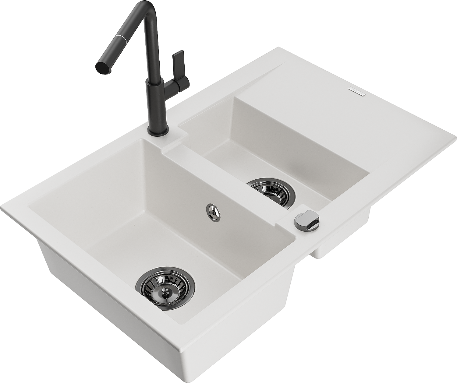 Mexen Gaspar évier en granit 1,5 bac avec égouttoir et robinet de cuisine Flora, blanc - 6507-20-670401-70-B
