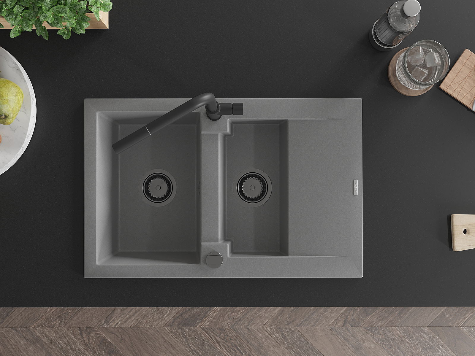 Mexen Gaspar évier en granit 1,5 bac avec égouttoir et robinet de cuisine Flora, gris - 6507-71-670401-70-B