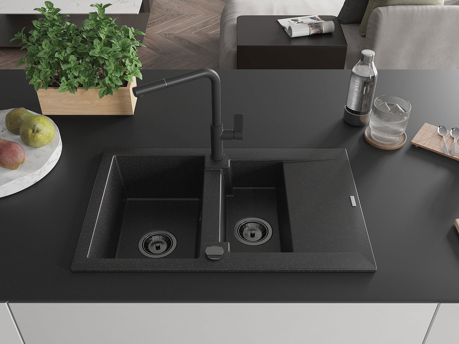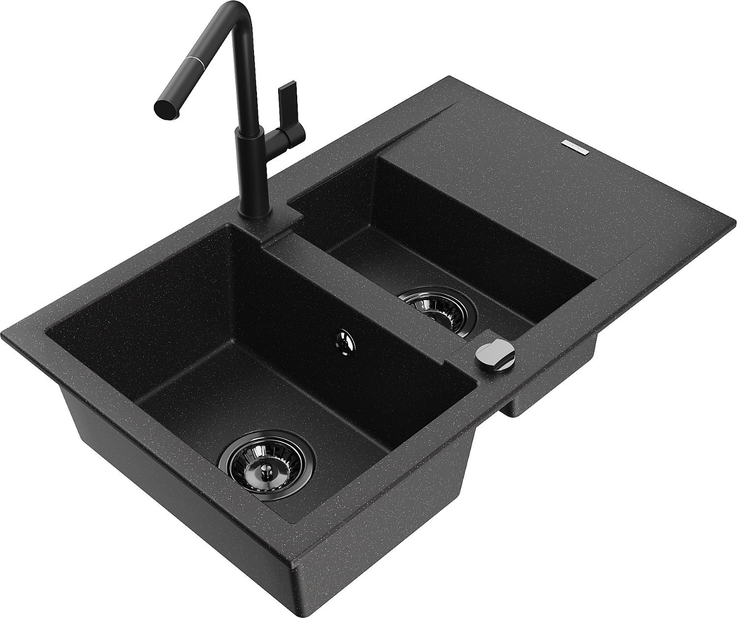 Mexen Gaspar évier en granit 1,5 bac avec égouttoir et robinet de cuisine Flora, noir/argent - 6507-73-670401-70-B