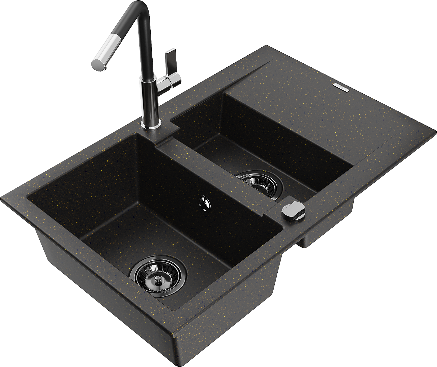 Mexen Gaspar évier en granit 1,5 bac avec égouttoir et robinet de cuisine Flora, noir/doré - 6507-75-670401-07-B