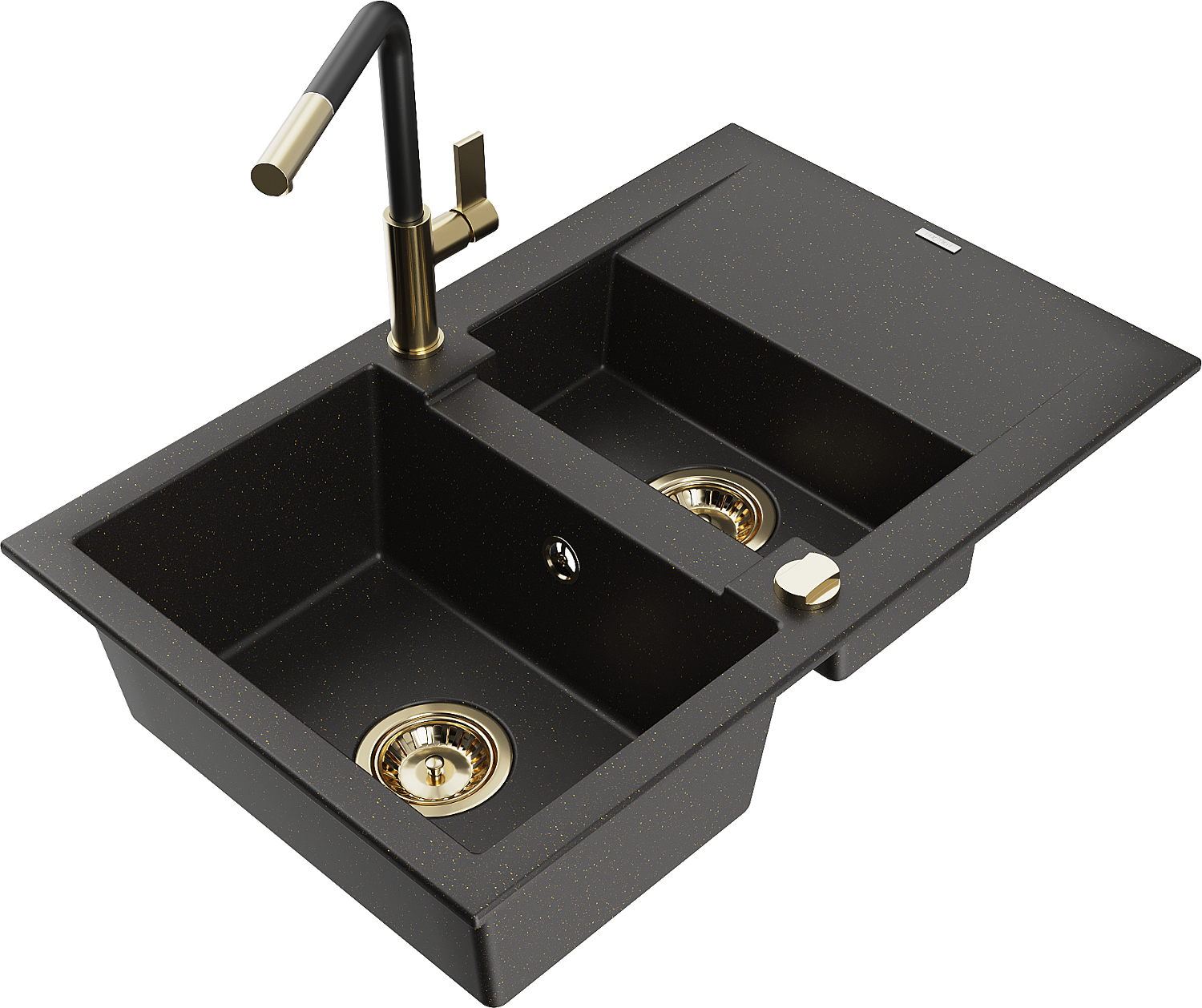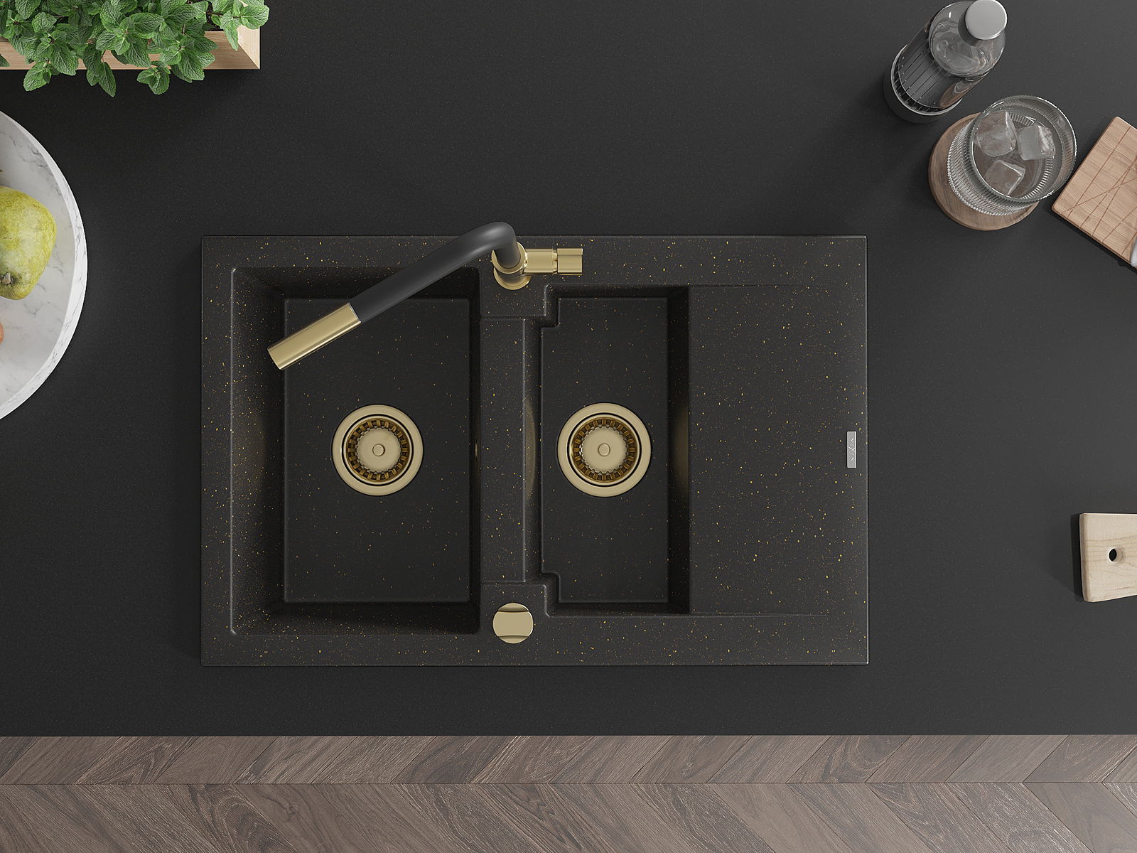 Mexen Gaspar évier en granit 1,5 bac avec égouttoir et robinet de cuisine Flora, noir/or - 6507-75-670401-57-G