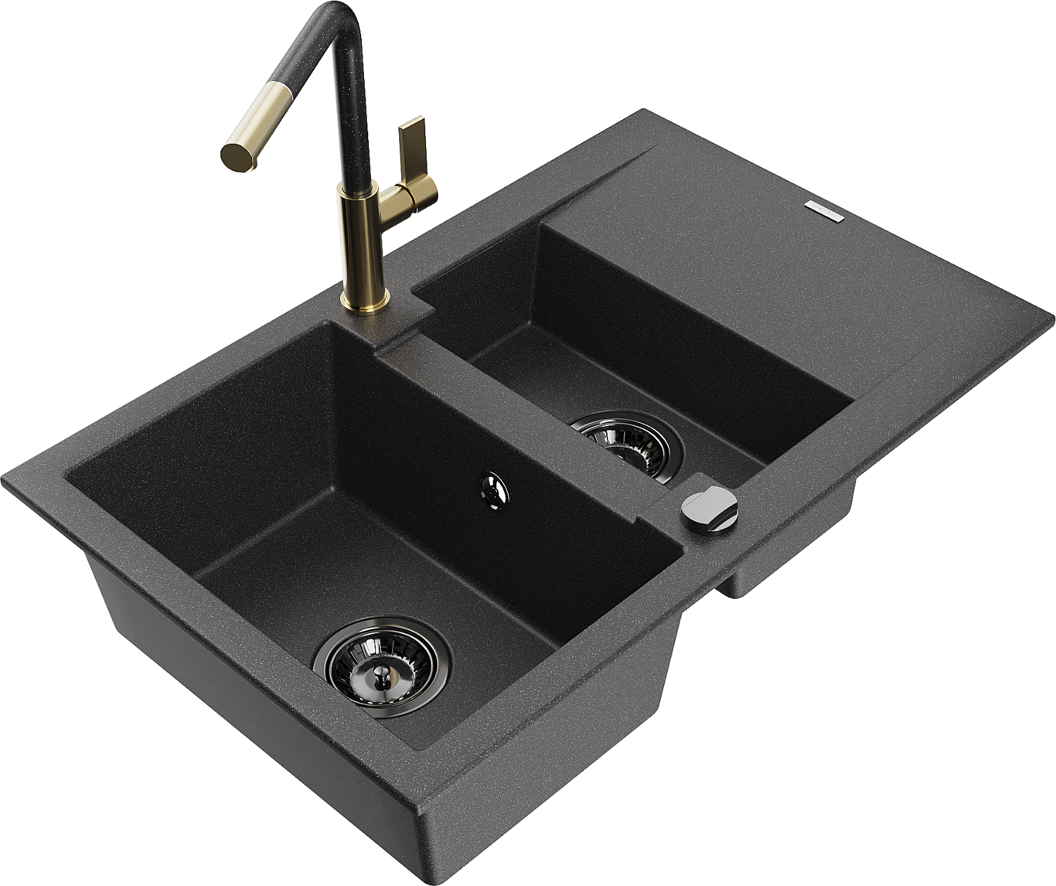 Mexen Gaspar évier en granit 1,5 bac avec égouttoir et robinet de cuisine Flora, noir moucheté - 6507-76-670401-75-B