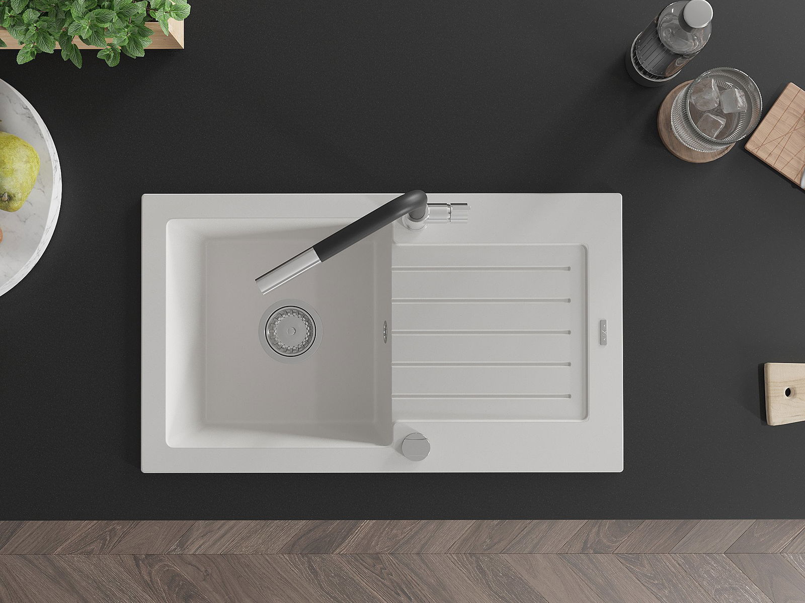 Mexen Pablo évier en granit 1 bac avec égouttoir et robinet de cuisine Flora, blanc - 6510-20-670401-07