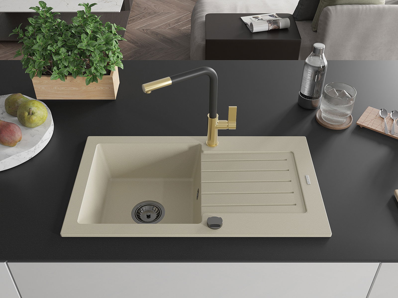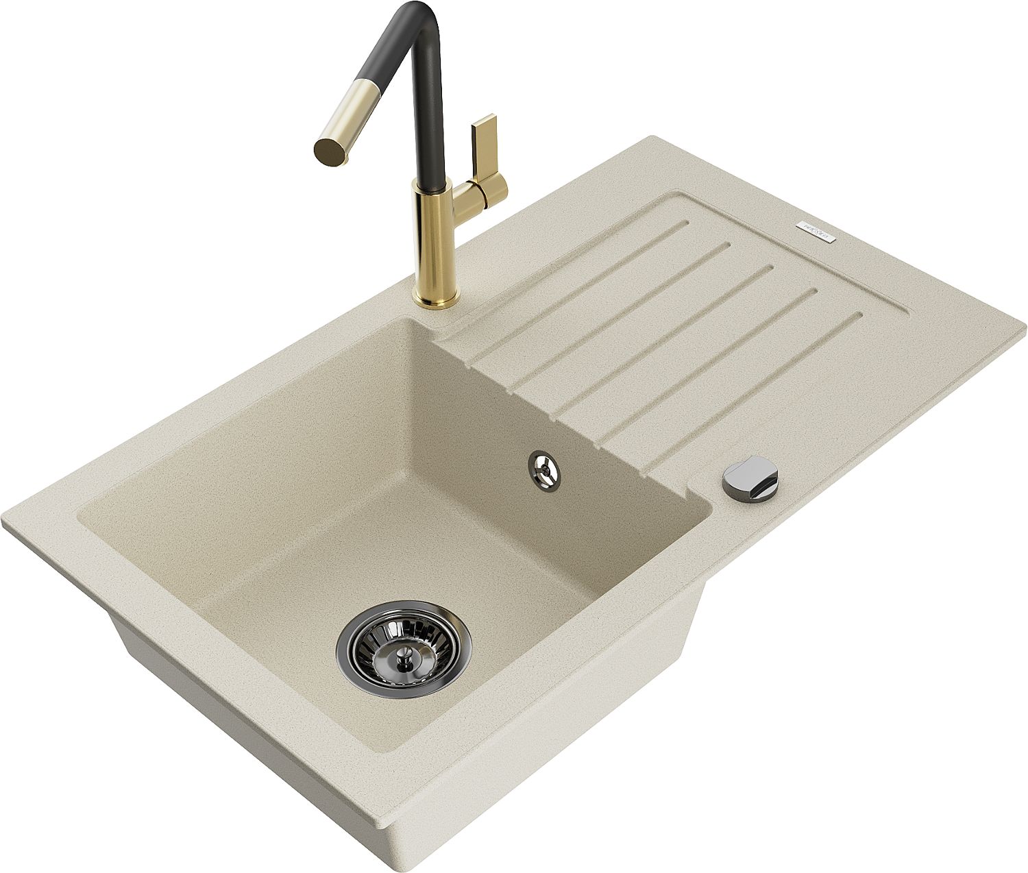 Mexen Pablo évier en granit 1 bac avec égouttoir et robinet de cuisine Flora, beige - 6510-69-670401-57-B