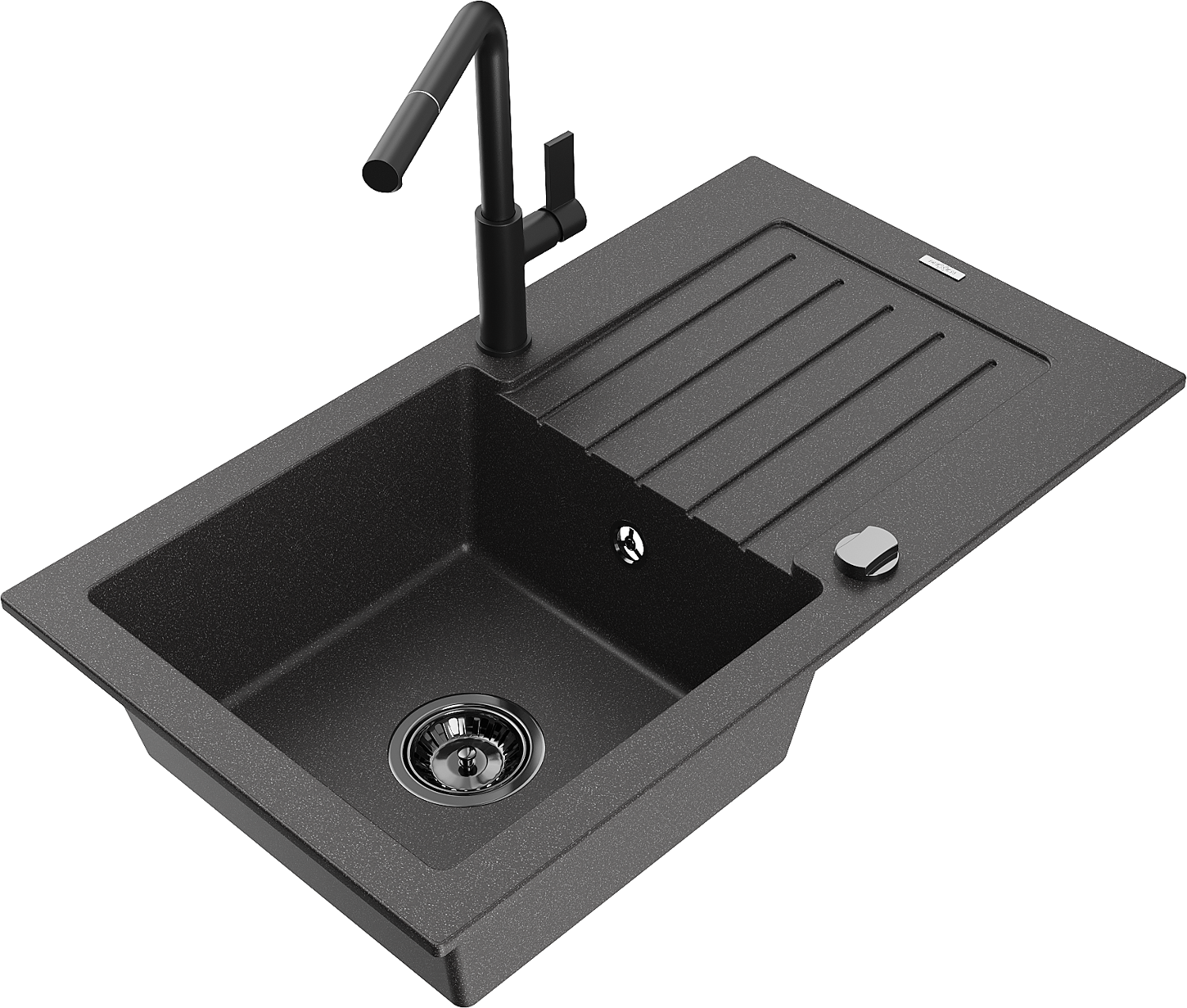 Mexen Pablo évier en granit 1 bac avec égouttoir et robinet de cuisine Flora, noir moucheté - 6510-76-670401-70-B