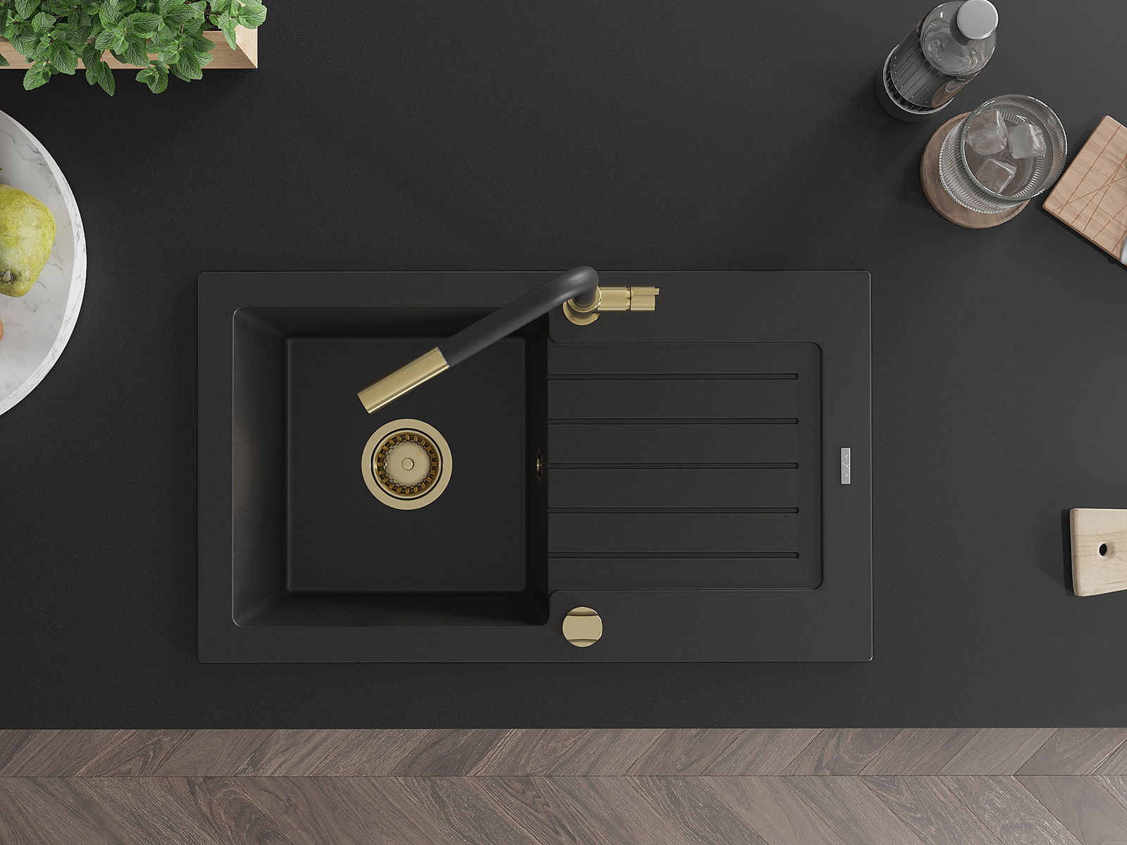 Mexen Pablo évier de cuisine en granit à 1 bac avec égouttoir et robinet de cuisine Flora, noir - 6510-77-670401-57-G