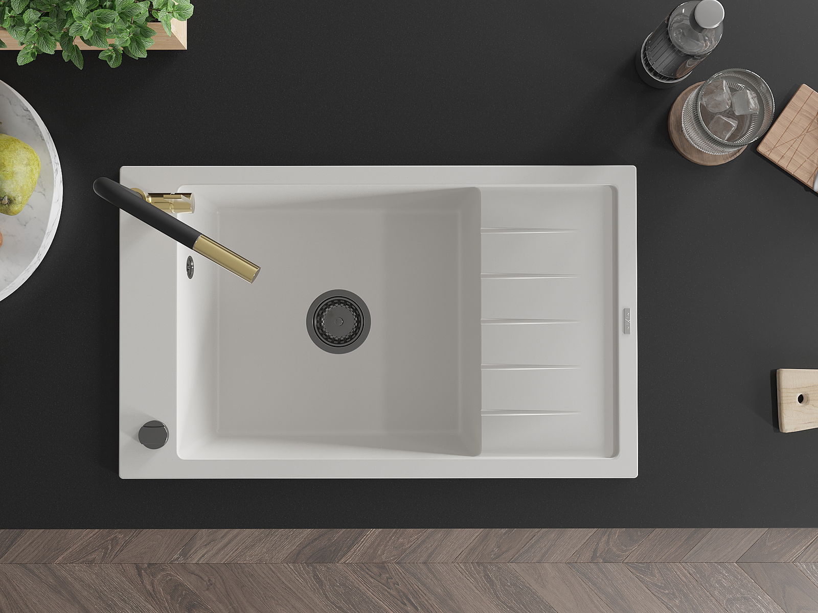 Mexen Elias évier en granit 1 bac avec égouttoir et robinet de cuisine Flora, blanc - 6511-20-670401-57-B