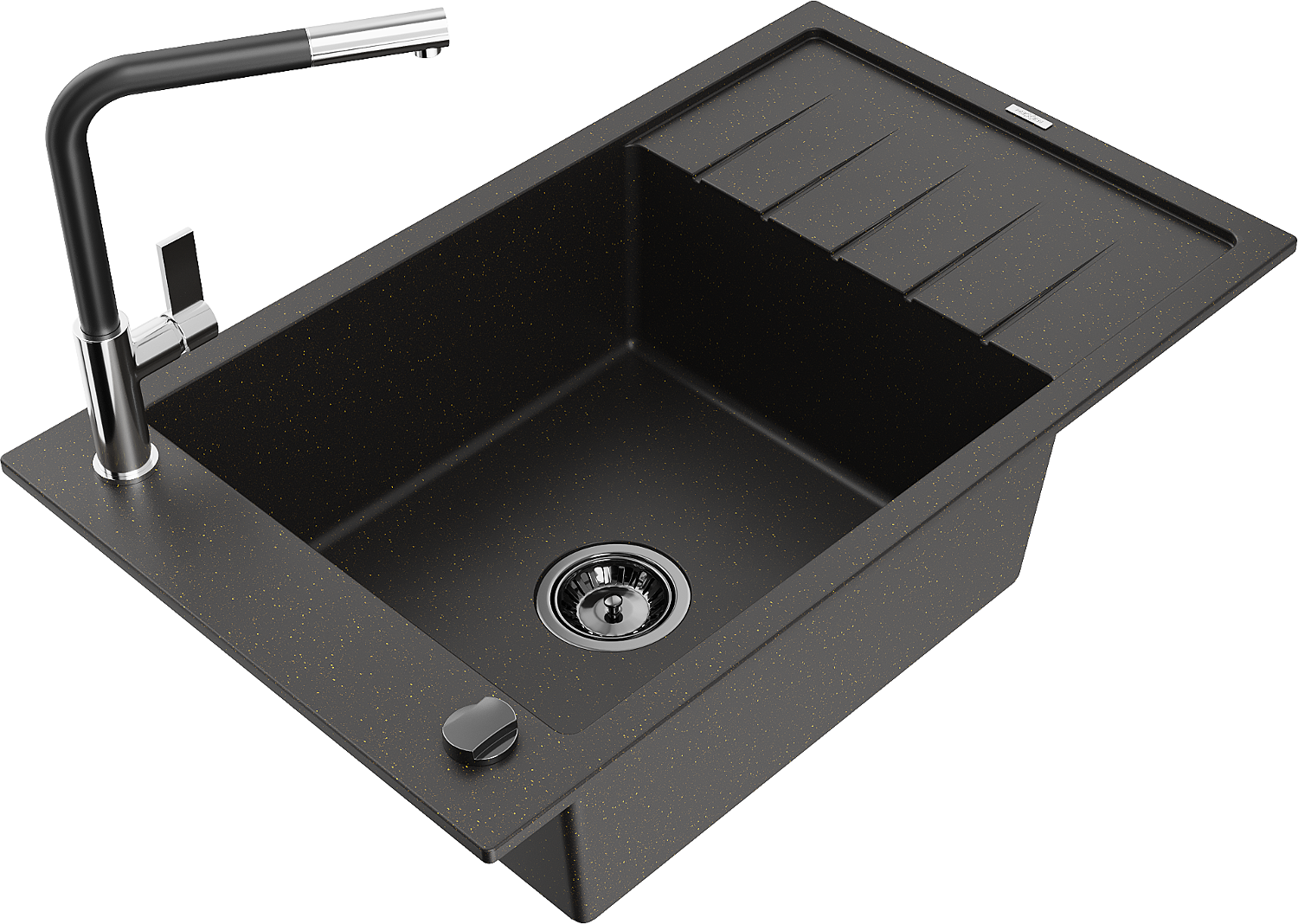 Mexen Elias évier en granit 1 bac avec égouttoir et robinet de cuisine Flora, noir/or métallique - 6511-75-670401-07-B