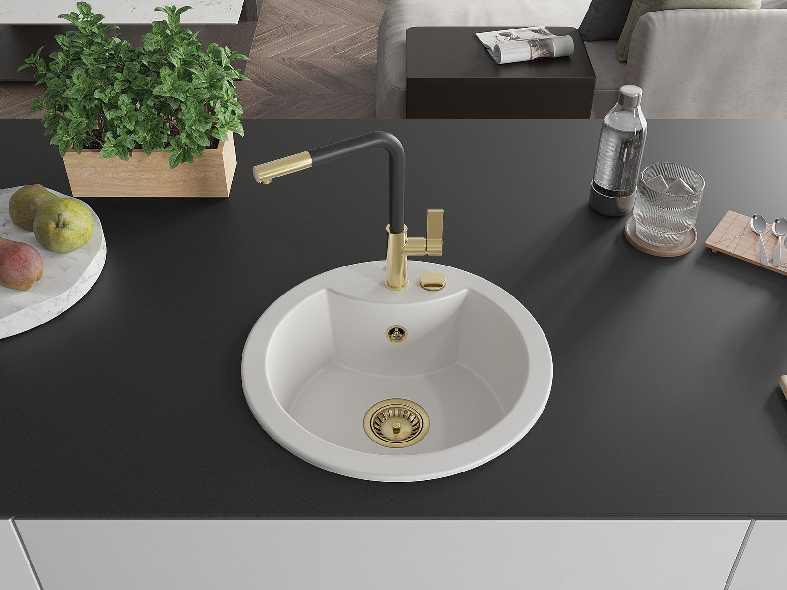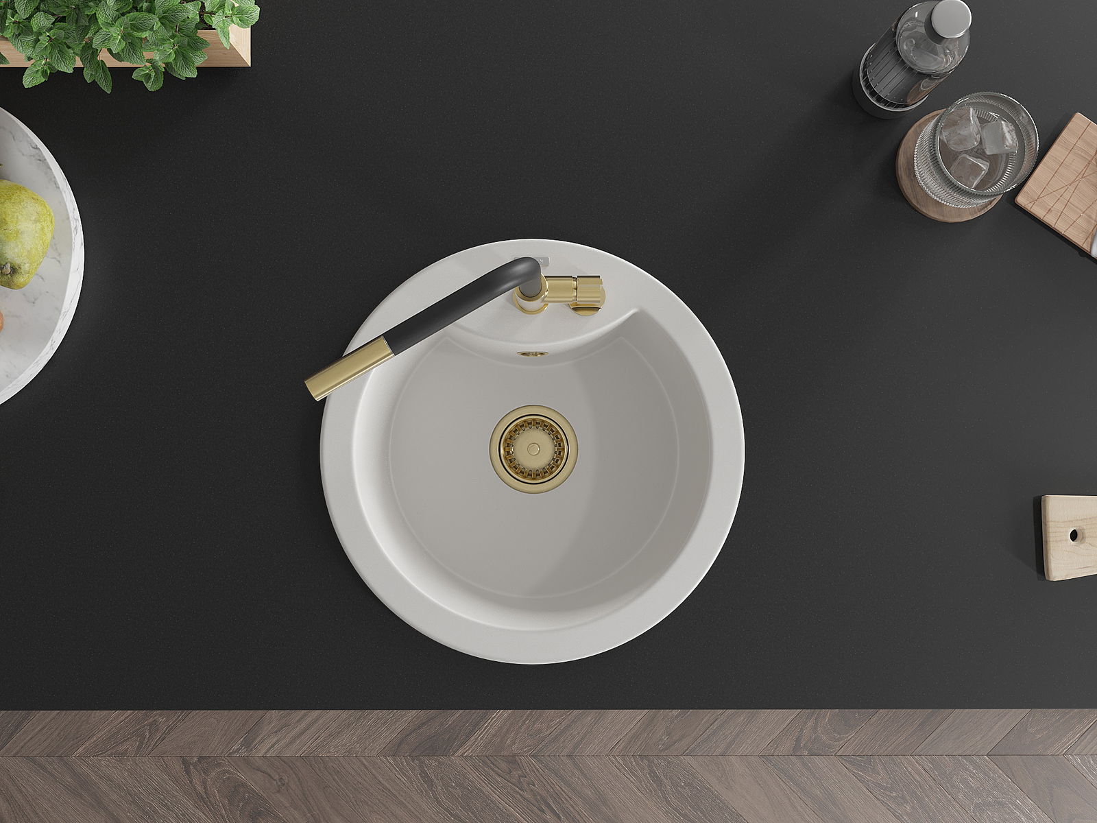 L'évier a un trou sous-meulé de 35 mm de diamètre à percer soi-même. Il peut être utilisé, entre autres, pour installer un distributeur de liquide, ce qui éliminera la présence de bouteilles en plastique dans la cuisine et lui donnera une finition élégante.