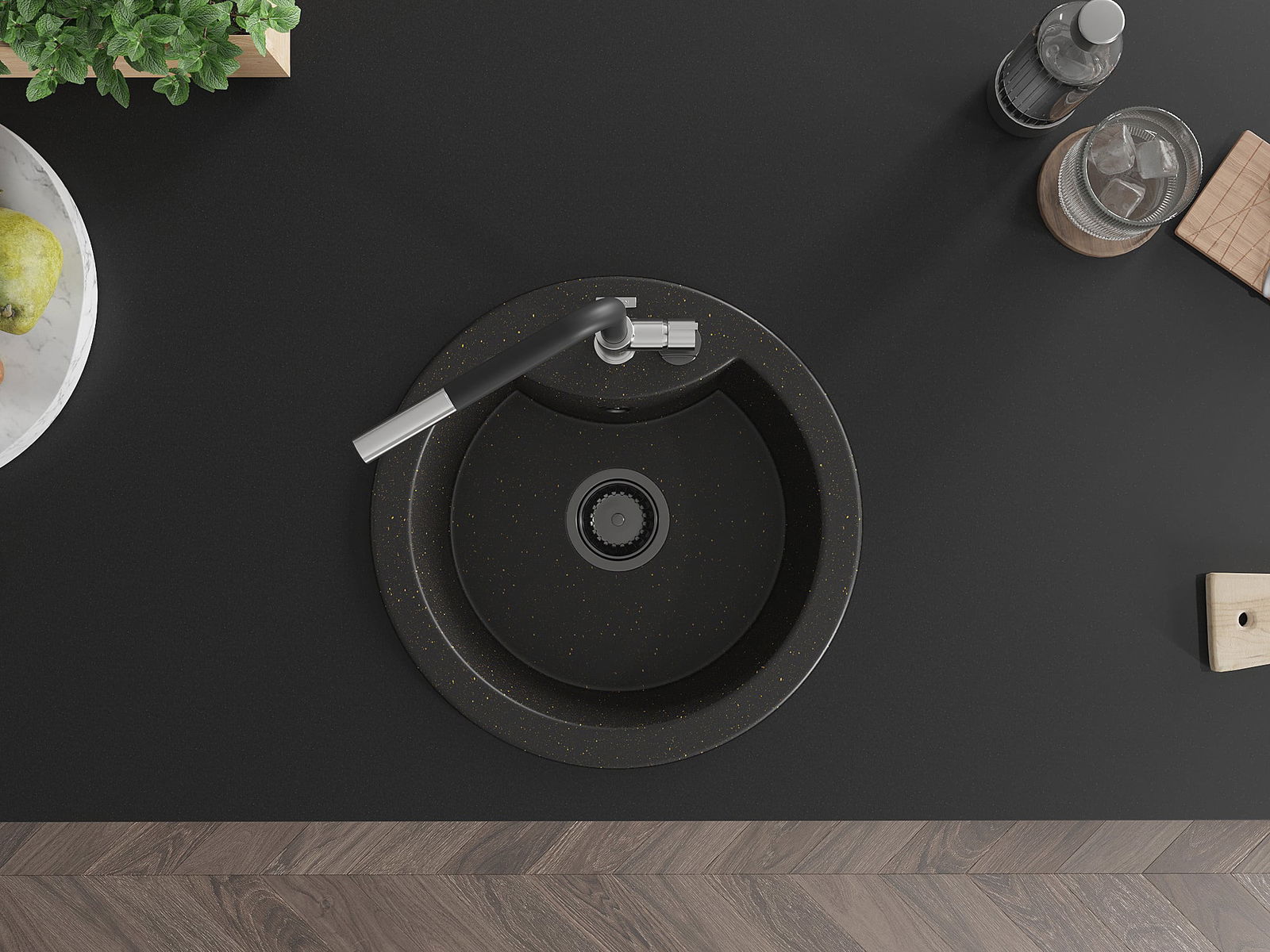 Mexen Diego évier en granit 1 bac avec robinet de cuisine Flora, noir/doré métallisé - 6512-75-670401-07-B