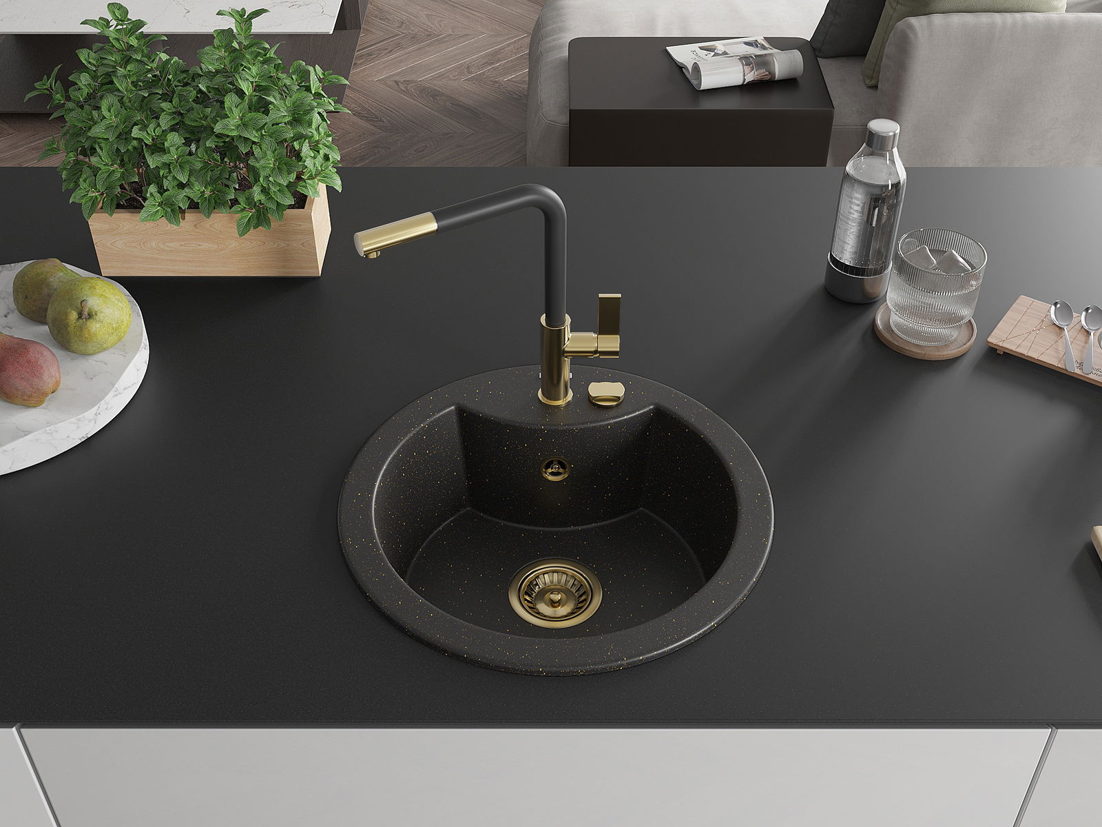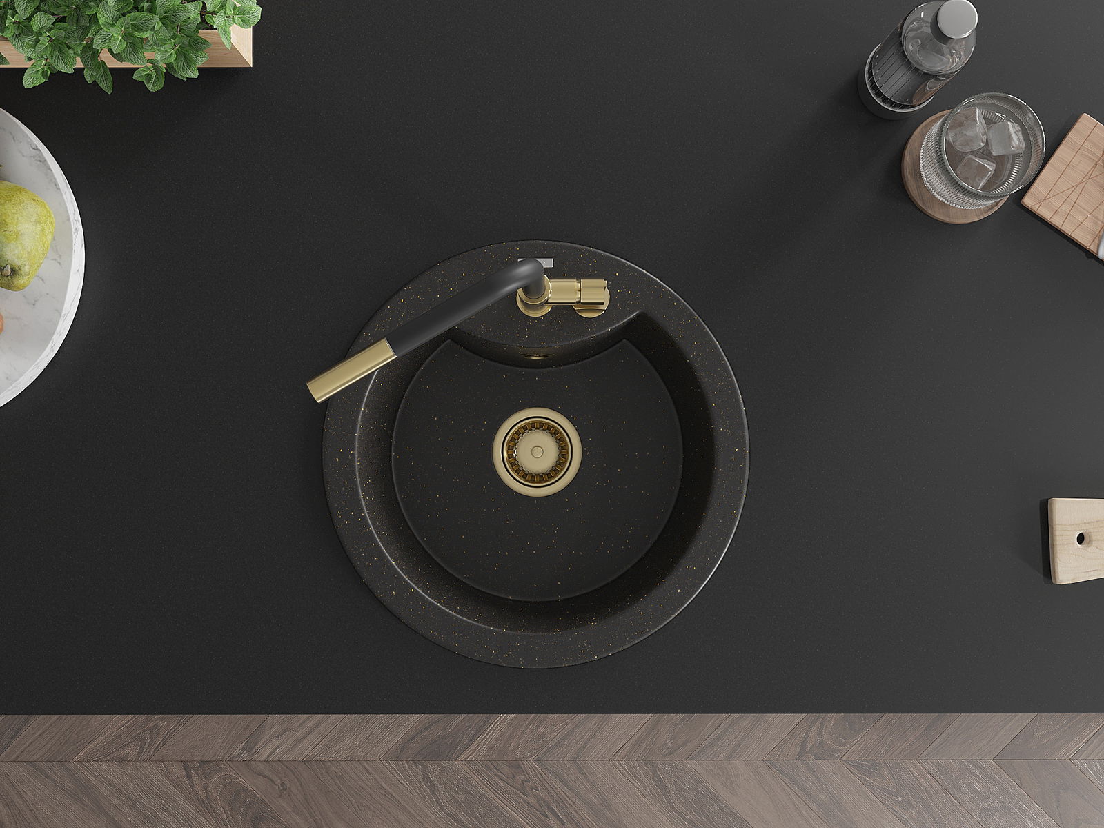 L'évier a un trou sous-meulé de 35 mm de diamètre à percer soi-même. Il peut être utilisé, entre autres, pour installer un distributeur de liquide, ce qui éliminera la présence de bouteilles en plastique dans la cuisine et lui donnera une finition élégante.