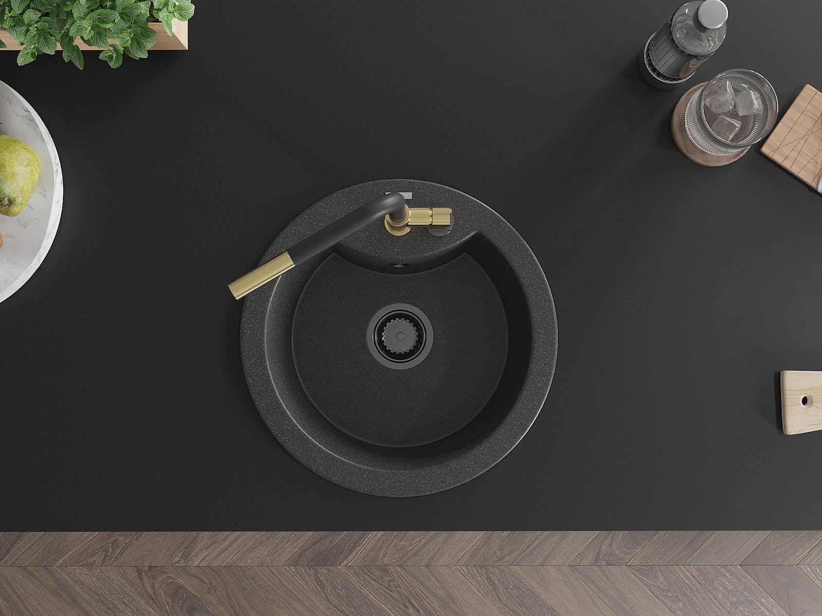L'évier a un trou sous-meulé de 35 mm de diamètre à percer soi-même. Il peut être utilisé, entre autres, pour installer un distributeur de liquide, ce qui éliminera la présence de bouteilles en plastique dans la cuisine et lui donnera une finition élégante.