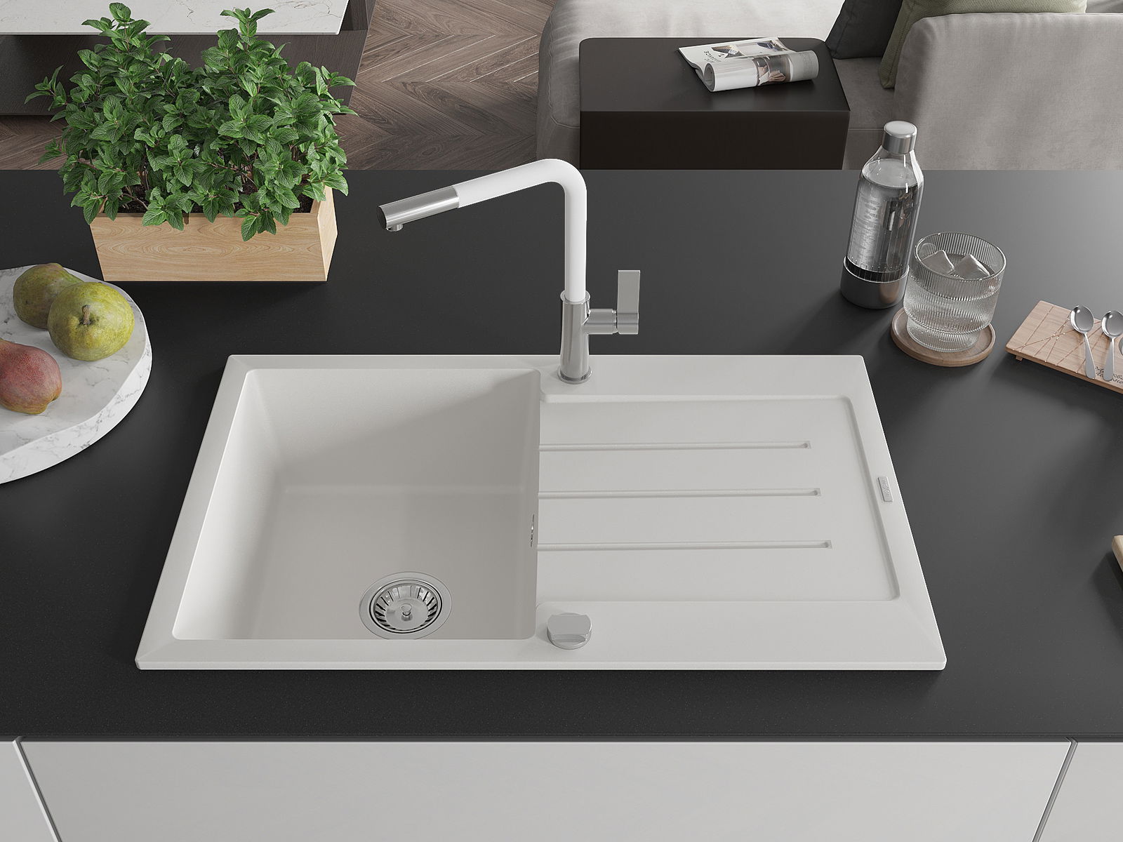 Mexen Bruno évier en granit 1 bac avec égouttoir et robinet de cuisine Flora, blanc - 6513-20-670401-02