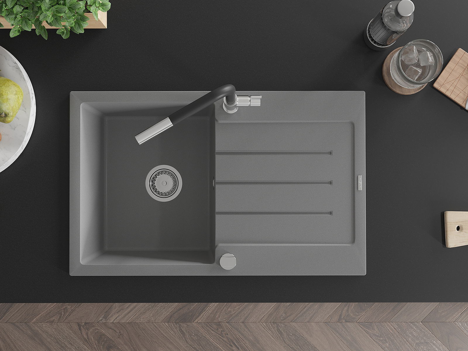 Mexen Bruno évier en granit 1 bac avec égouttoir et robinet de cuisine Flora, gris - 6513-71-670401-07