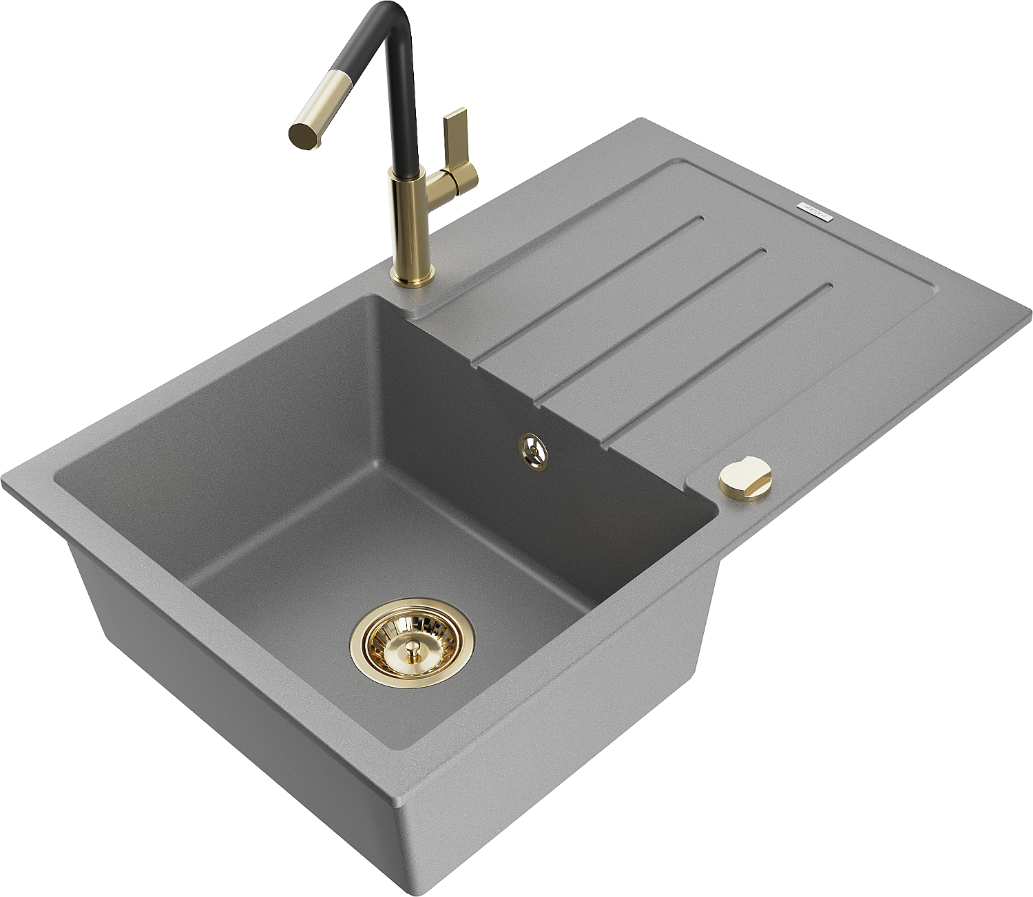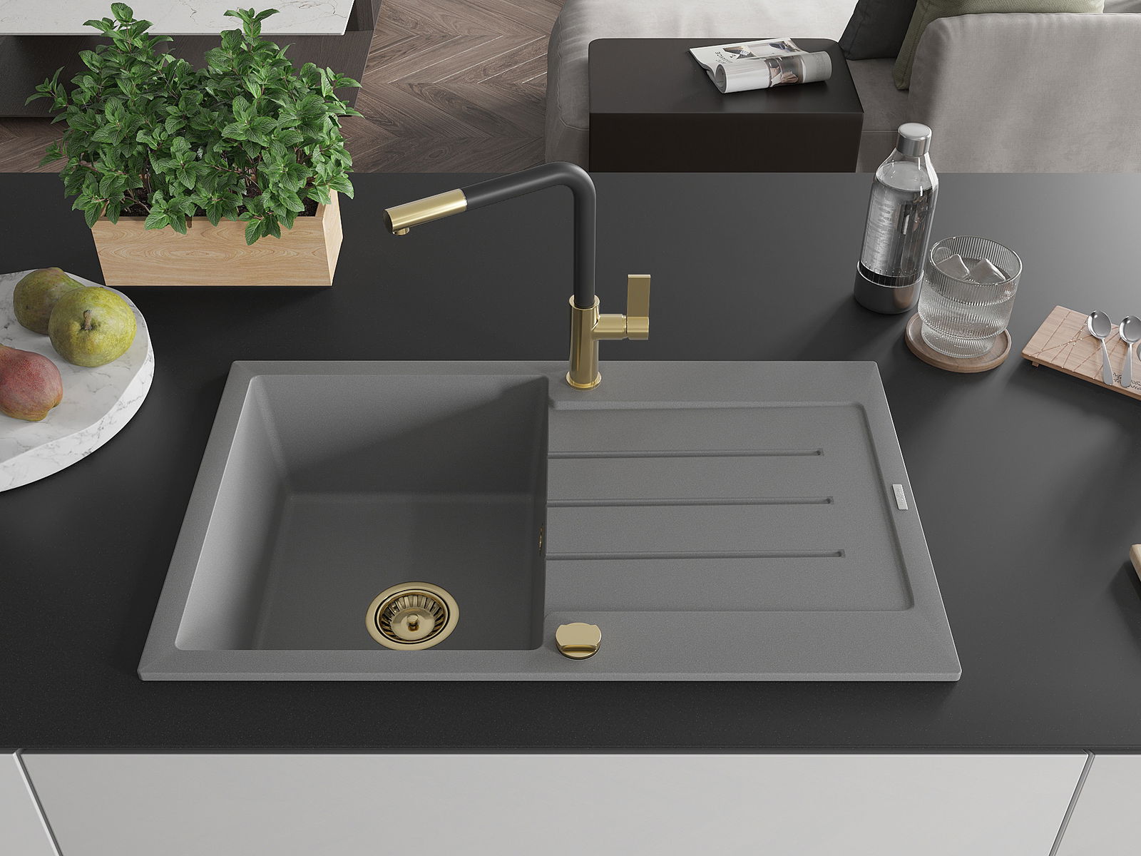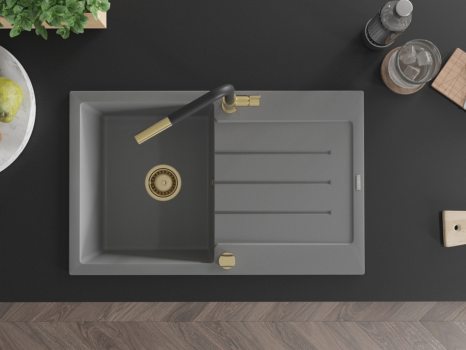 Mexen Bruno évier en granit à 1 bac avec égouttoir et robinet de cuisine Flora, gris - 6513-71-670401-57-G