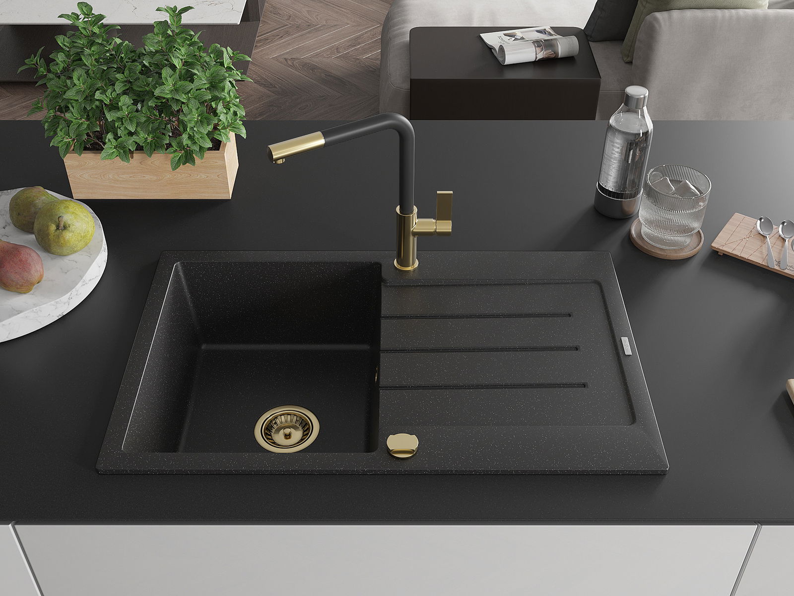 Mexen Bruno évier en granit à 1 bac avec égouttoir et robinet de cuisine Flora, noir/métallique argenté