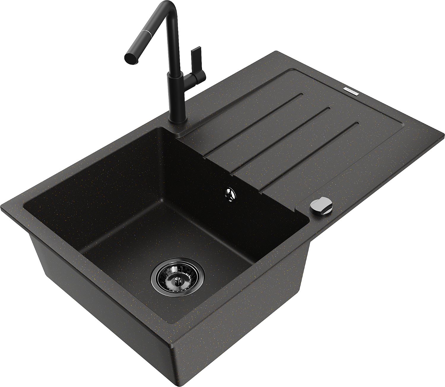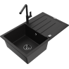 Mexen Bruno évier en granit à 1 bac avec égouttoir et robinet de cuisine Flora, noir/or métallisé - 6513-75-670401-70-B
