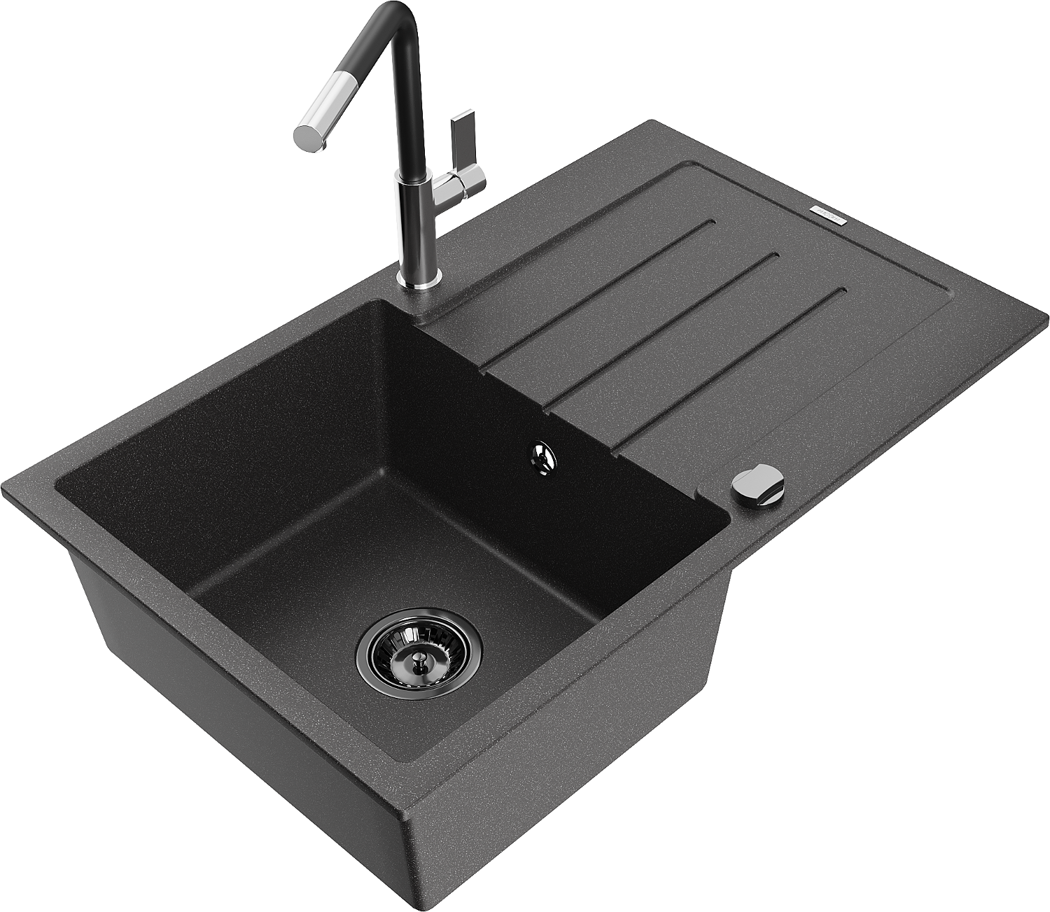 Mexen Bruno évier de cuisine en granit 1 bac avec égouttoir et mitigeur Flora, noir tacheté - 6513-76-670401-07-B