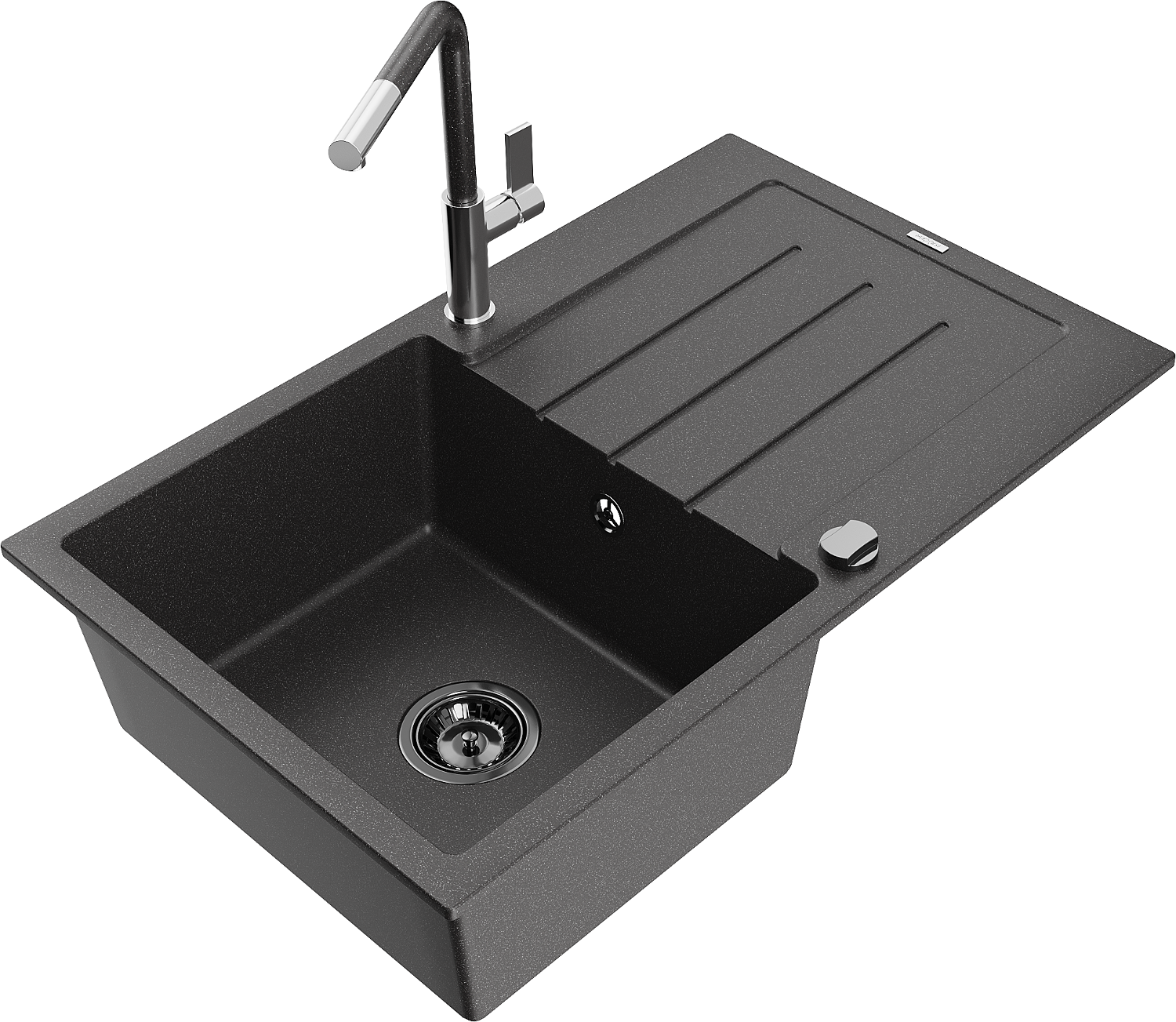 Mexen Bruno évier en granit à 1 bac avec égouttoir et robinet de cuisine Flora, noir moucheté - 6513-76-670401-08-B