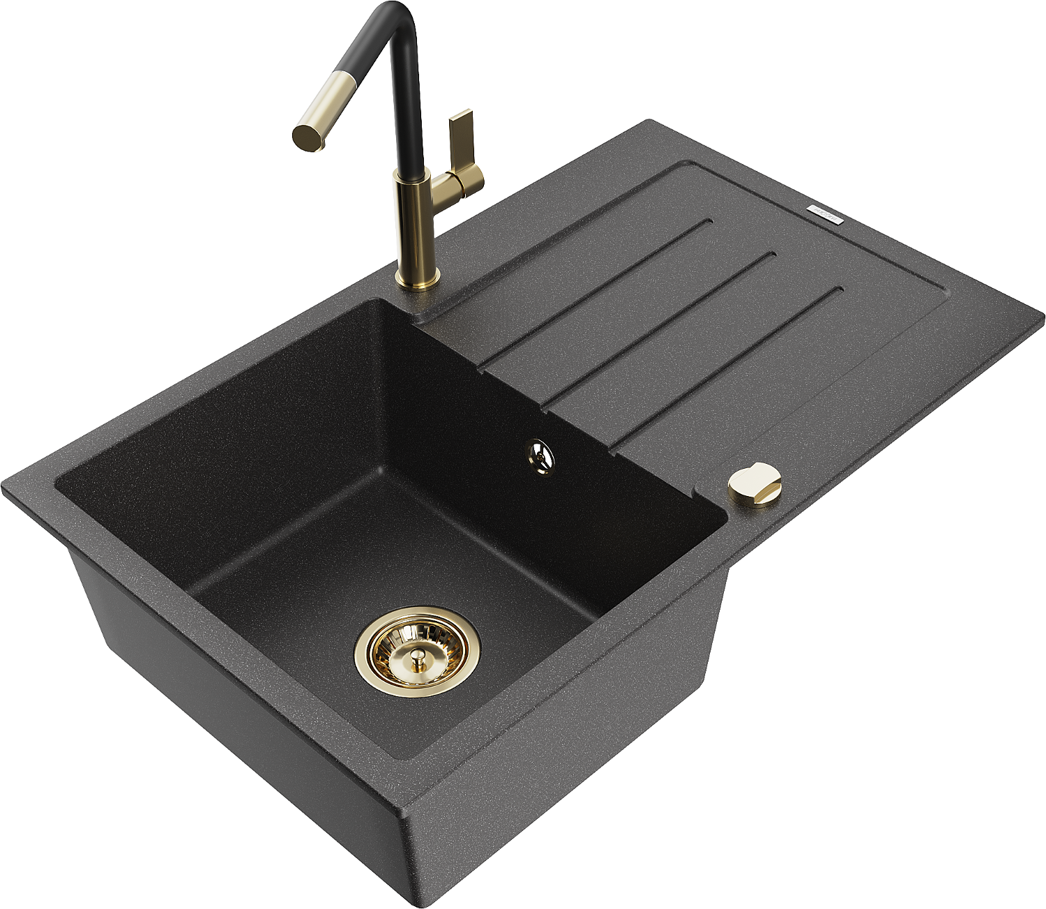 Mexen Bruno évier en granit 1 bac avec égouttoir et robinet de cuisine Flora, noir moucheté - 6513-76-670401-57-G