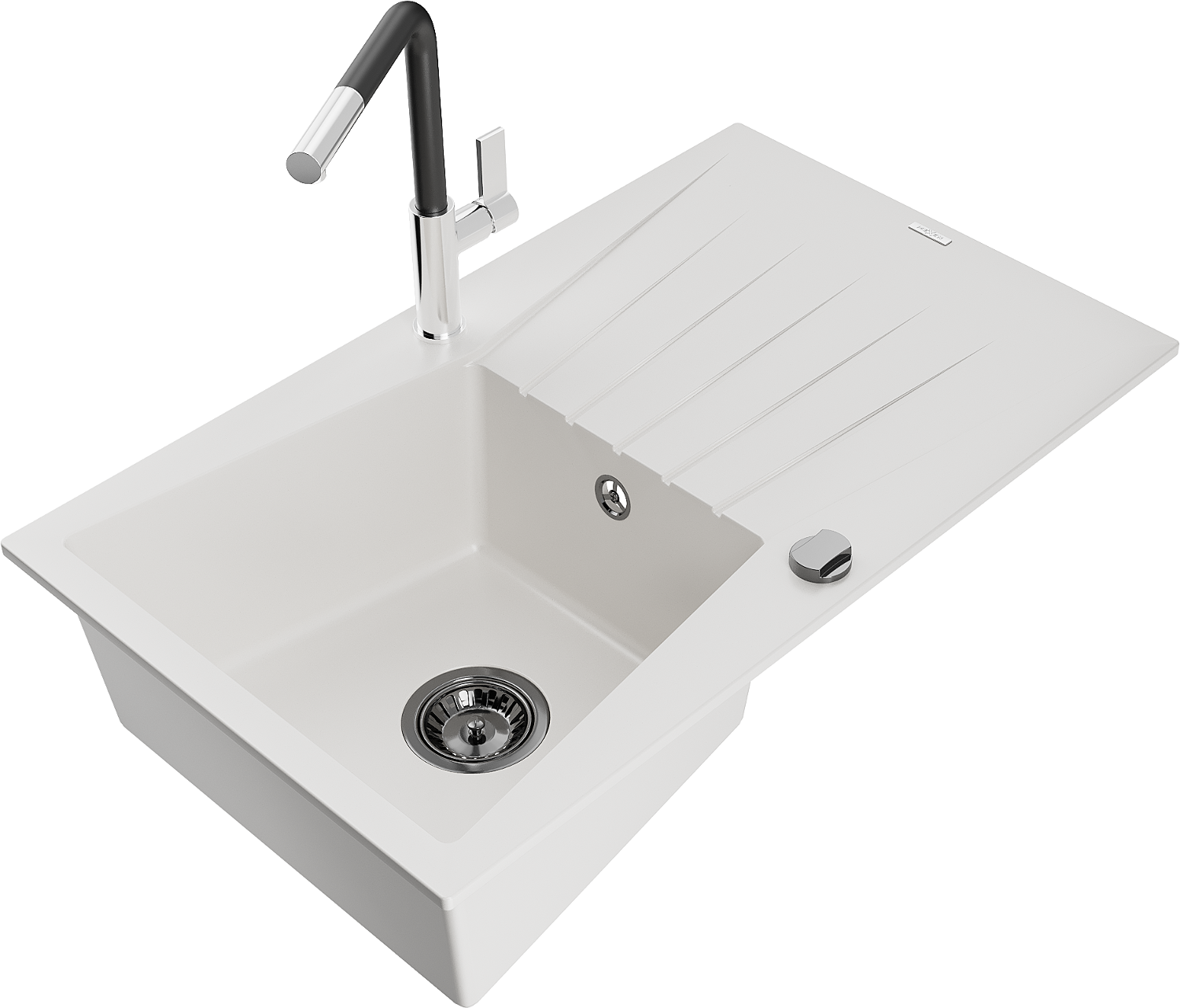 Mexen Cesar évier en granit 1 bac avec égouttoir et robinet de cuisine Flora, blanc - 6514-20-670401-07-B